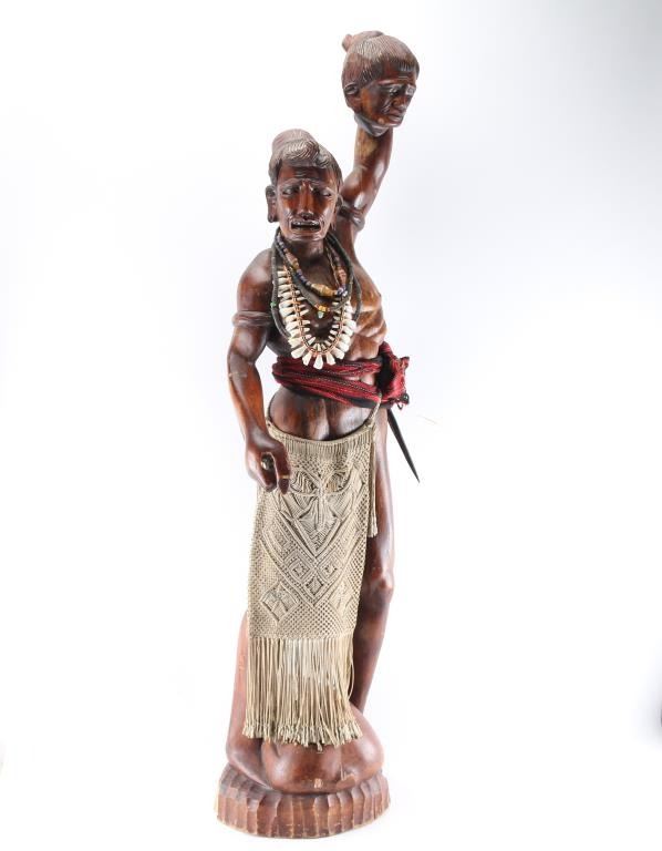 Holding head in air. Measures 52" tall x 39" around. Woven sashes tied at waist, one holding carved knife. He is wearing 4 shell necklaces.