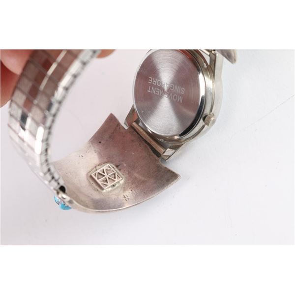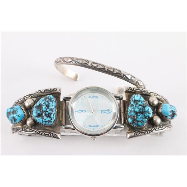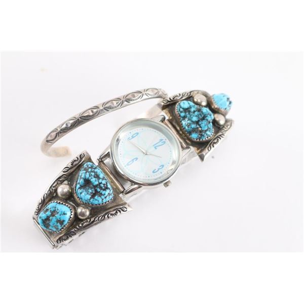 Four turquoise nuggets set in sterling silver, two on each side, of a working watch on flexible band. Includes a thin etched sterling silver cuff measuring 7 1/4" including gap.