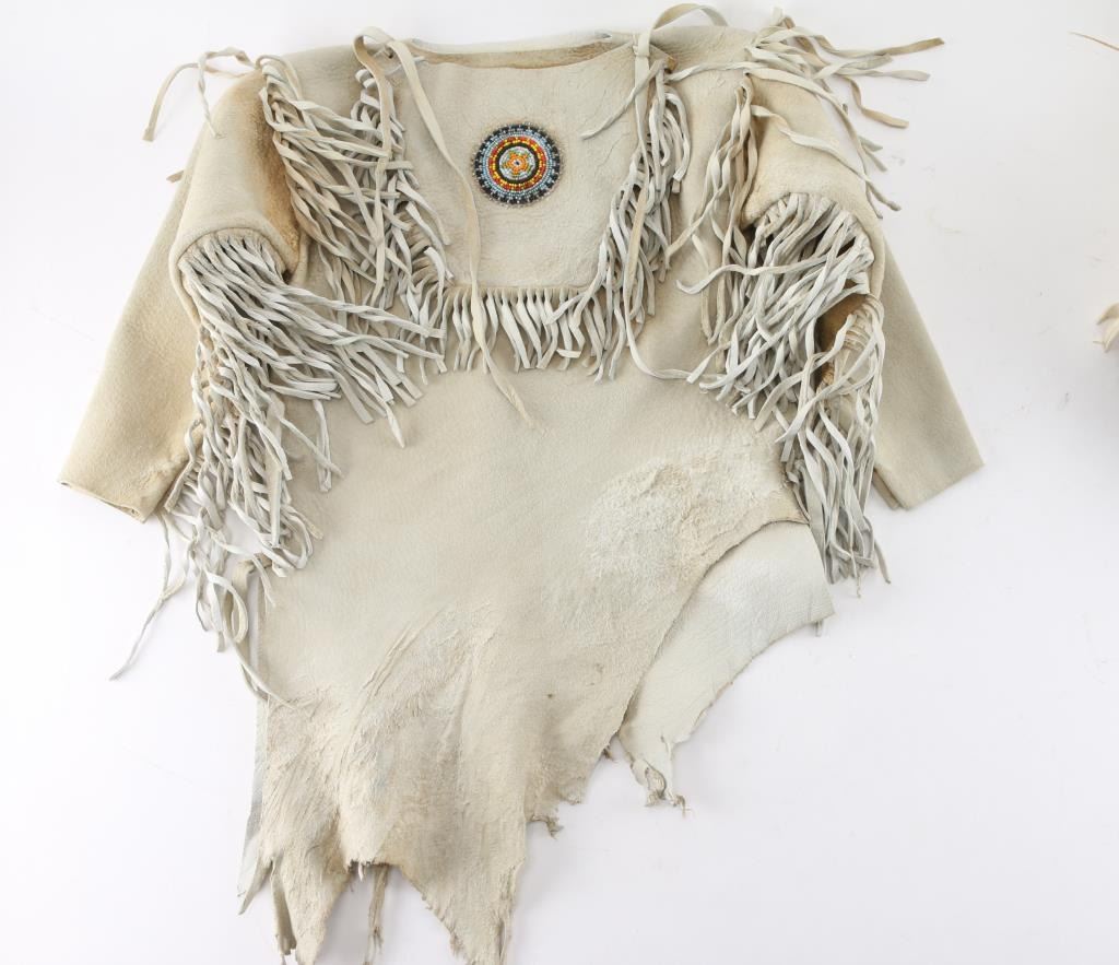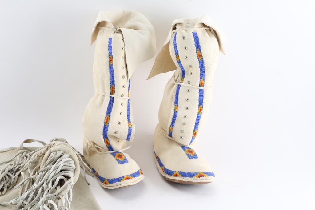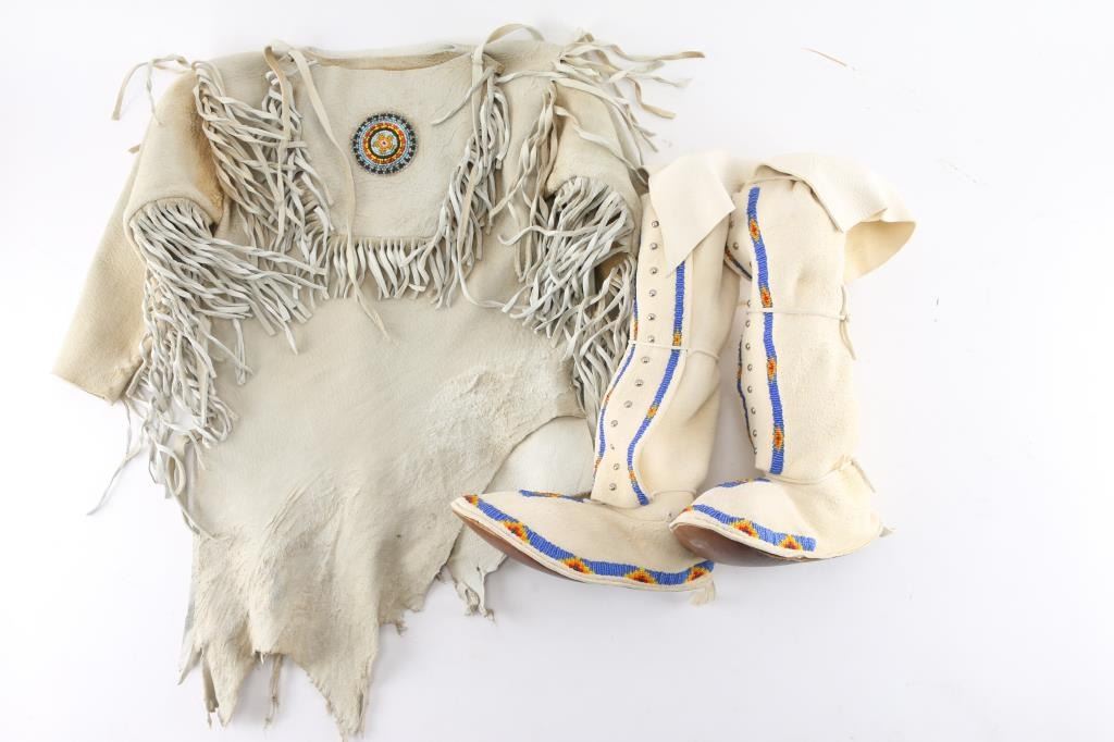 (1) Tall leather mocassins with blue, yellow, red beaded design, measure 14" tall and feet measure 9". (1) Leather shirt with fringe and beaded medallion on shirt front. Small size.