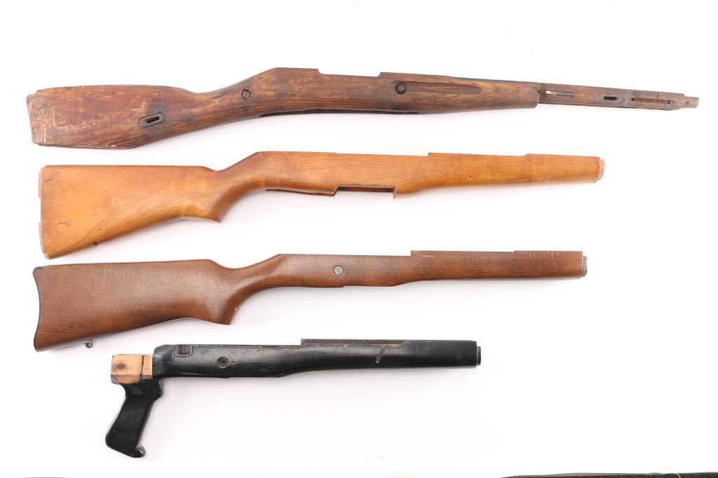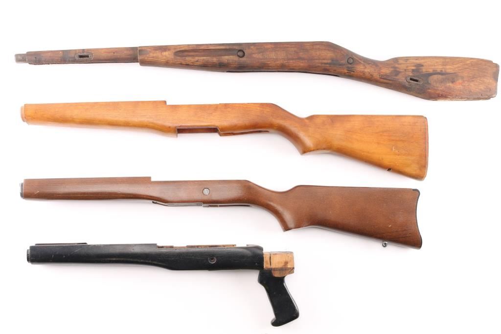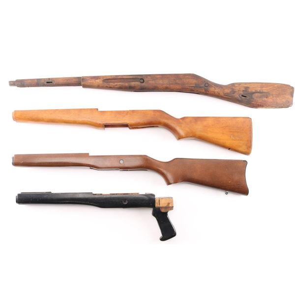 4 Total. 1) M1 Garand stock. Blonde wood, no metal fittings. Very good condition.2) Ruger Mini 14/Ranch rifle stock with metal fittings including the blue metal buttplate. 3) Russian M38 carbine stock. Poor condition with 5" out of the lower buttstock, metal fittings are pitted. 4) M1 Carbine pistol grip stock. Painted black, no metal fittings.