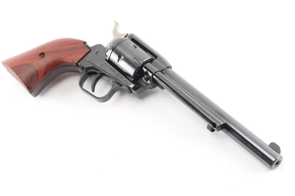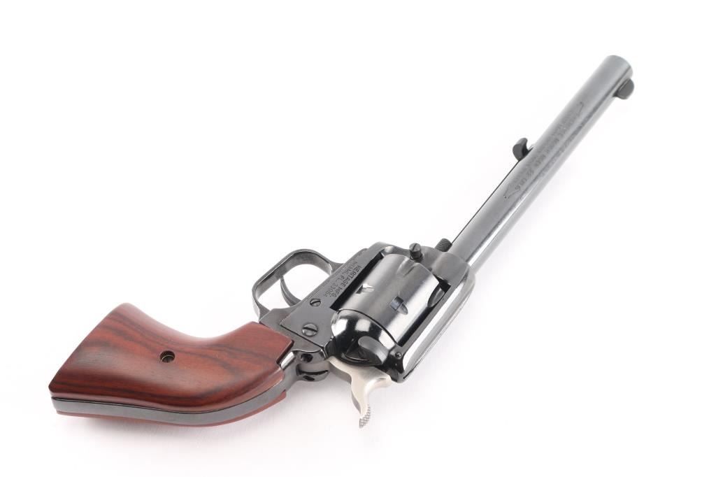 American made Single Action 6-Shot Revolver chambered for .22 caliber ammuntion and comes with fluted .22LR cylinder. It features a 4.75" black barrel with frame, grip frame and trigger to match. It sports a blade front sight, integral rear sight, safety on the left side of the hammer with knurled spur and two piece Cocobolo grips. Metal finish looks great, little to no signs of use or wear. Wood grips are fine. Bore looks very good, a little dusty. Condition is NRA Excellent. Modern Firearm