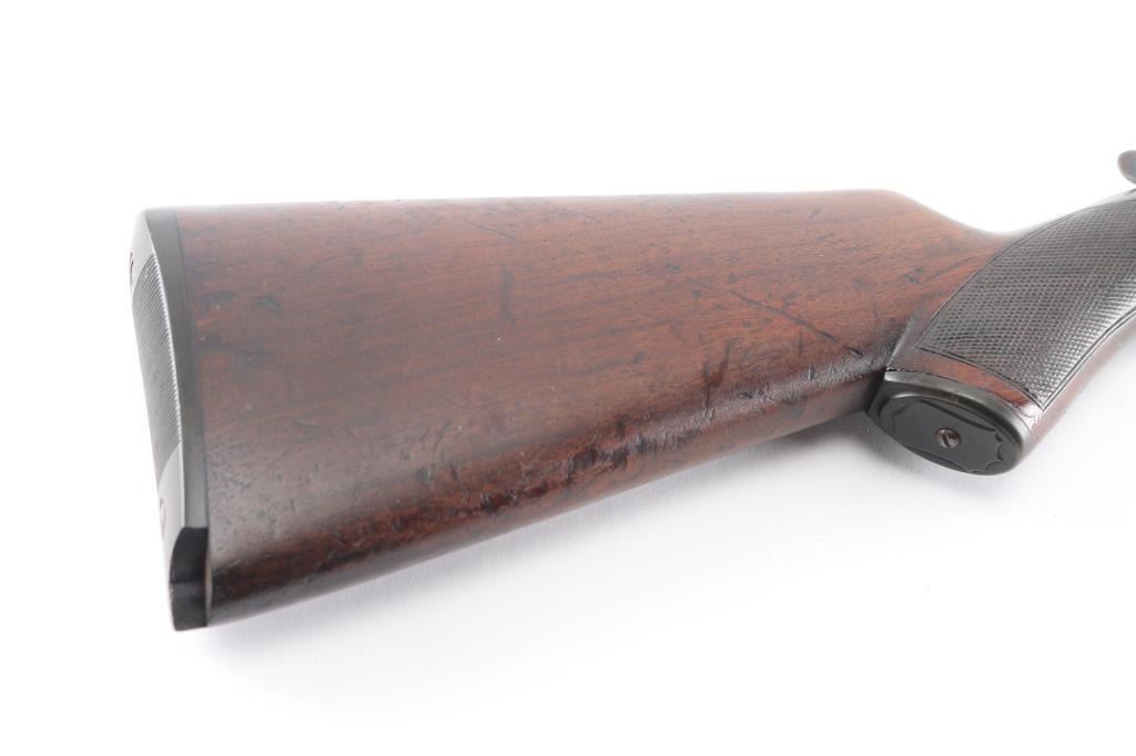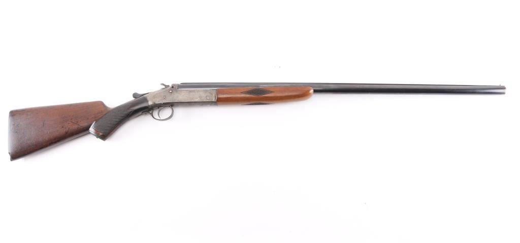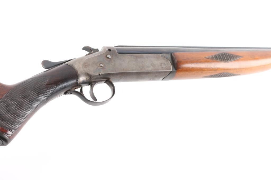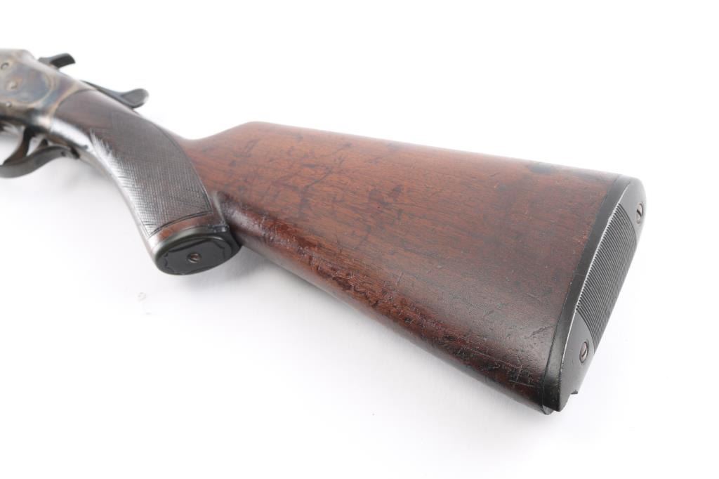 Single barrel break open shotgun features 30" solid rib barrel, brass bead, blued finish, checkered wood stock & forend, plastic buttplate, top lever opening, exposed hammer. 2 3/4" chamber. Bore is very good/bright, fixed CYL choke. Bluing is about 80% with slight muzzle wear, some scratches/rubs on the right lower barrel Wood is sound with scratches/dings. Case colors of receiver, hammer & trigger is about 20% with handling wear. There is a chip out of the lower buttplate. LOP-14".Condition-Fair to Good. C&R Firearm