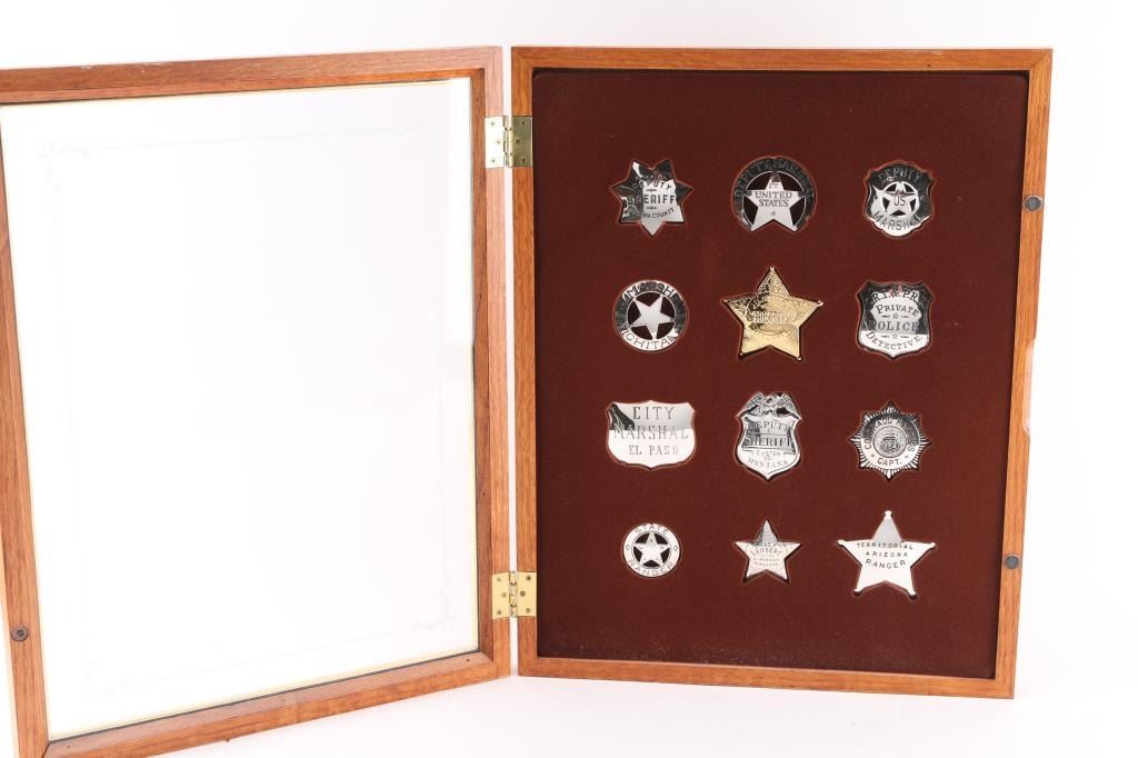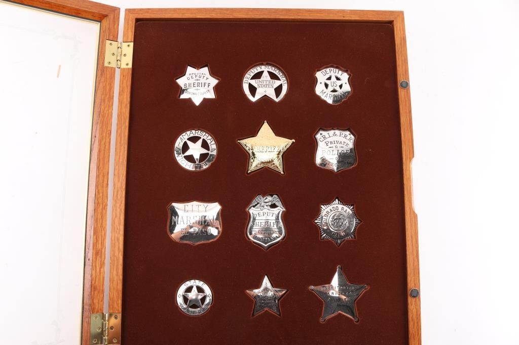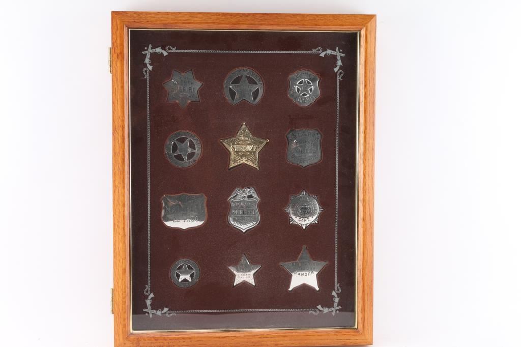 Includes 12 Ranger, Marshall, and Sheriff badges (Sonoma County, Wichita, El Paso, Montana, Colorado, etc.). 20" x 16"