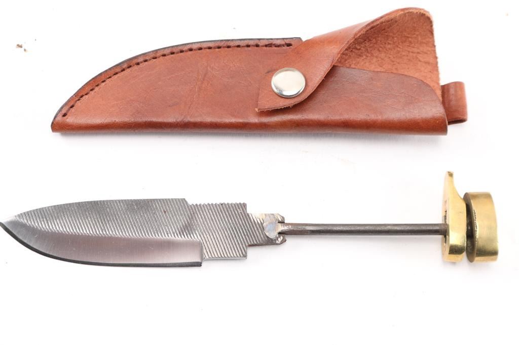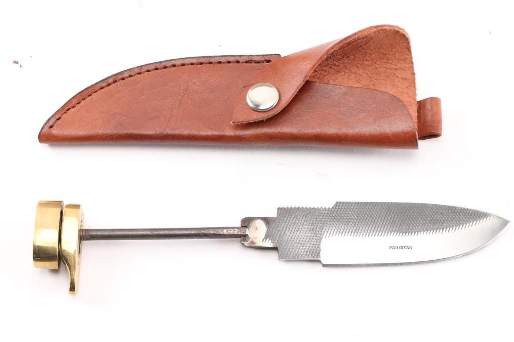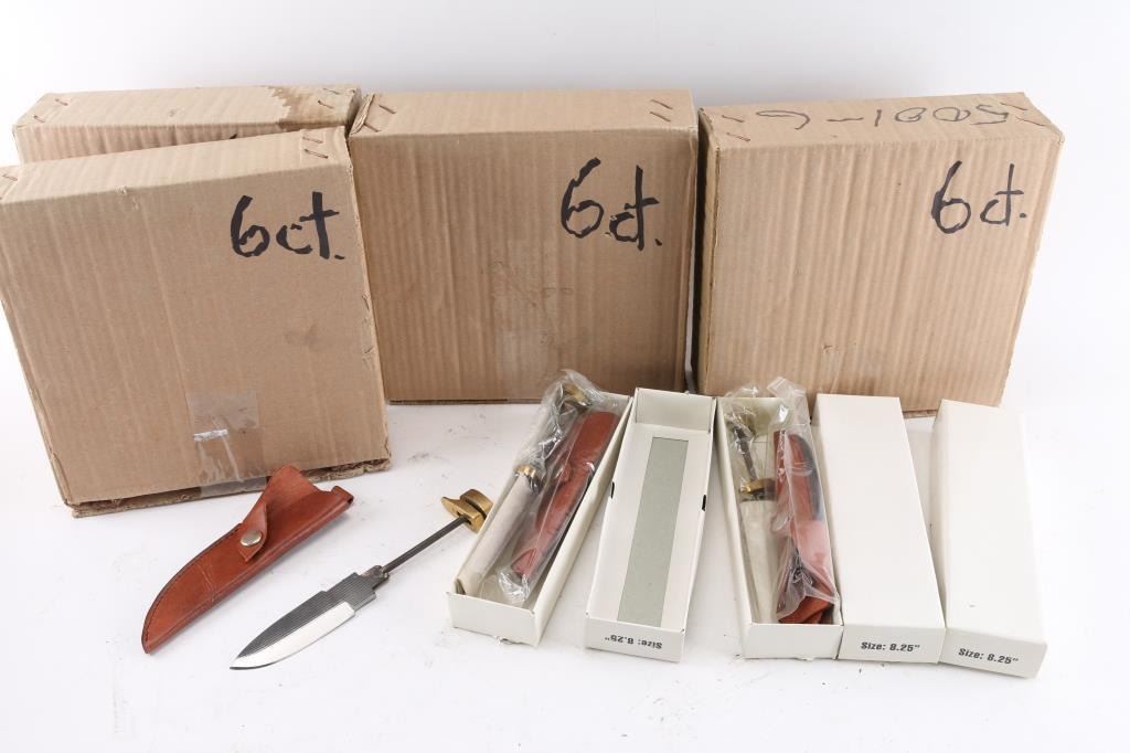 Total of 36 unused blades. Made in Pakistan from tooled steel. 4" clip point blade, 8 1/4" overall. All have brass guards, pommels and brown leather sheaths, NO HANDLES. Lot would make for a great knife shop assignment. One carton w/2 blades inside, 6 boxes total.