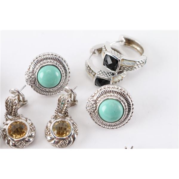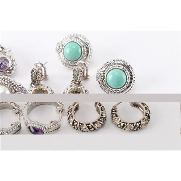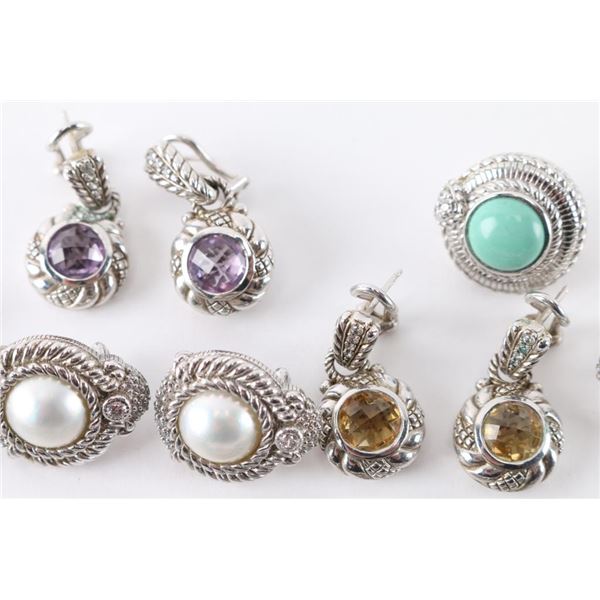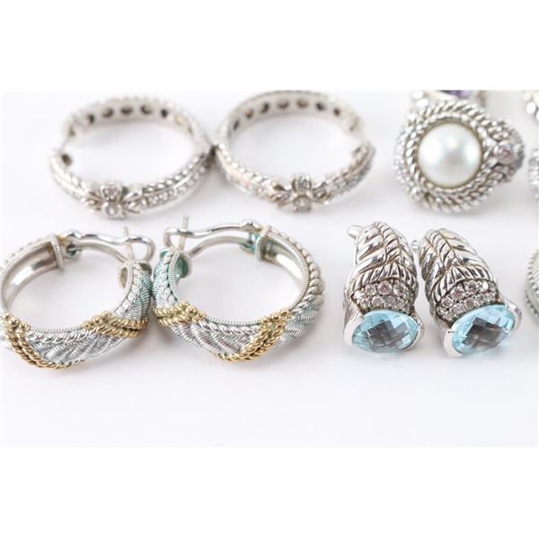 Beautiful Judith Ripka sterling silver pierced earrings, each a different style, some with gemstones, CZs, and/or gold accents, some dangle, some half hoops.