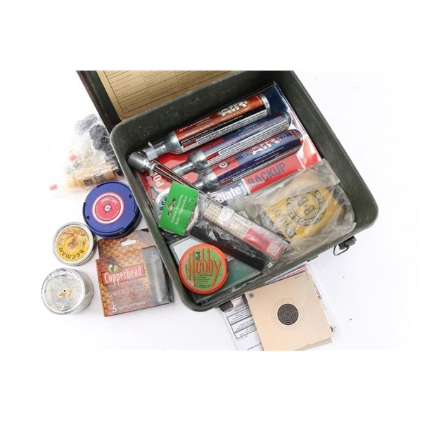 Includes three unused backup Co2 88g cylinders (2-Crosman & 1-Gameface); four unused Copperhead Co2 12g cylinders; approx. 300 - .25 cal. pellets & 300 - BBs, cleaning rods & more. All in green French military first aid kit container.