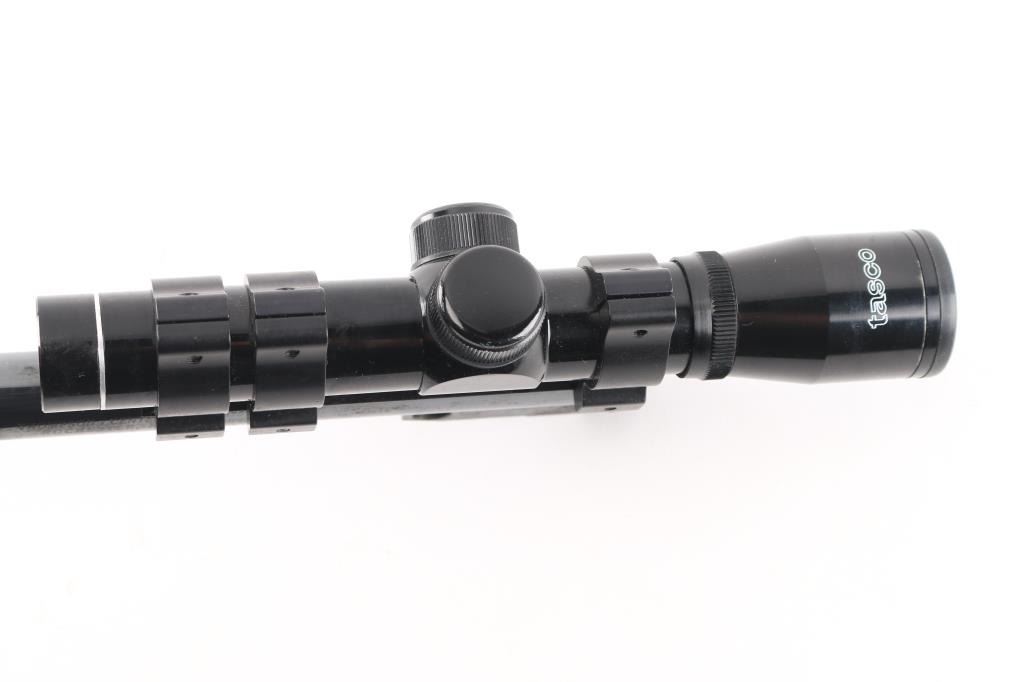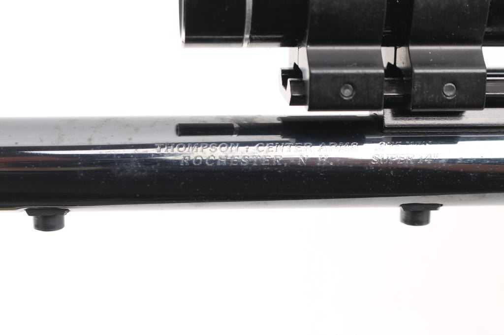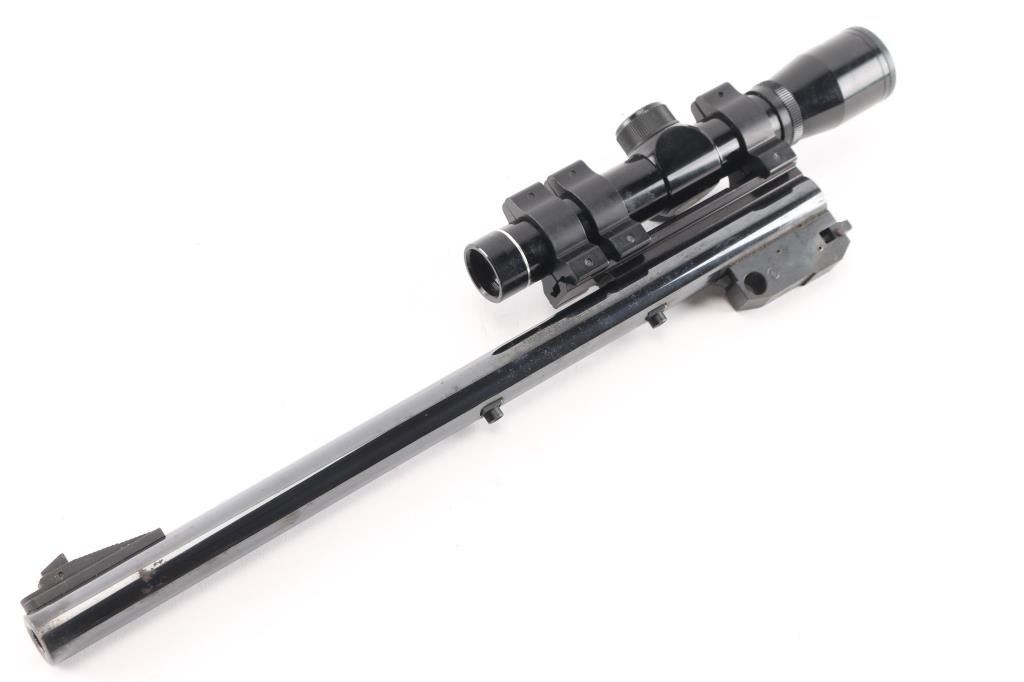 (1) - 375 Win. 14" blued round barrel w/a serrated ramp blade front sight, topped w/a 2 X 20 Tasco scope, excellent bore and strong rifling. some rust spots on front left of barrel and edge wear.