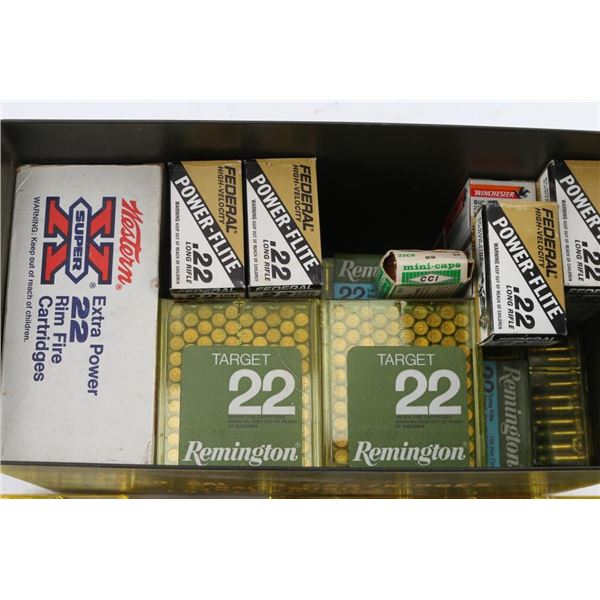 Approx. 3500 rounds of .22 Long Rifle factory new ammunition. Approx. 1800 rds Remington target, 40 Gr. lead projectile; Approx. 1k of Winchester Super X, 40 & 37 Gr. copper HP & FMJ; Approx. 500 rds Peters, 40 Gr. lead projectile & approx. 200 rds Federal, 40 Gr. lead projectile. All in factory boxes w/metal ammo can.