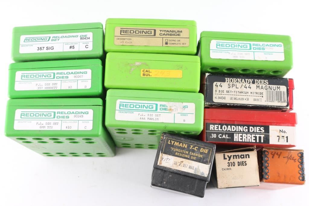 Includes 7 - Redding sets 357 Sig, 357 Herrett, .243, 444 Marlin, 45 Colt, 6 & 7mm TCU; 3 - Lyman 45-70, 357 Mag & 44 Spl/Mag; 1 - Hornady 44 Spl/Mag & 1 - Pacific Durachrome 30 Herrett. All good to very good condition.