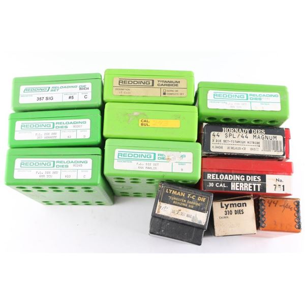 Includes 7 - Redding sets 357 Sig, 357 Herrett, .243, 444 Marlin, 45 Colt, 6 & 7mm TCU; 3 - Lyman 45-70, 357 Mag & 44 Spl/Mag; 1 - Hornady 44 Spl/Mag & 1 - Pacific Durachrome 30 Herrett. All good to very good condition.