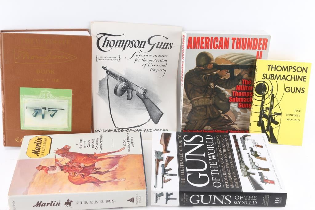 including "Marlin Firearms" by Brophy, "The Illustrated Guide to Guns of the World" by Will Fowler, "The History of Winchester Firearms 1866-1966" by George Watrous, "The Ultimate Thompson Book" by Hill and many other titles & authors. Also approx. 100 postcards of "Turquoise Mines of the United States", 6" X 9". All are in very good condition.