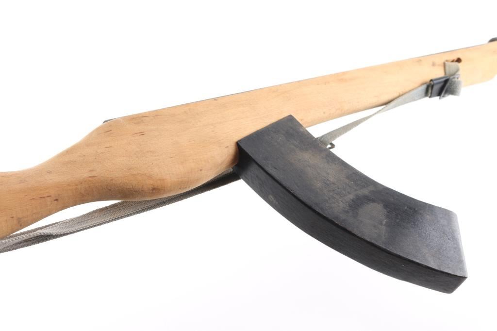 Übungsgewehr Modell 4.853. East German bayonet training rifle, believed to have been designated the M85, resembles the AK47 rifle (East German MPiK). Comes with a spring loaded bayonet with bulbous rubber tip and grooved grips. The ¨bayonet¨can be removed from the rifle for hand to hand training. Note that the rifle does not have pistol grip since the right hand did not grasp the pistol grip during bayonet use. Very good condition with the correct issue sling.