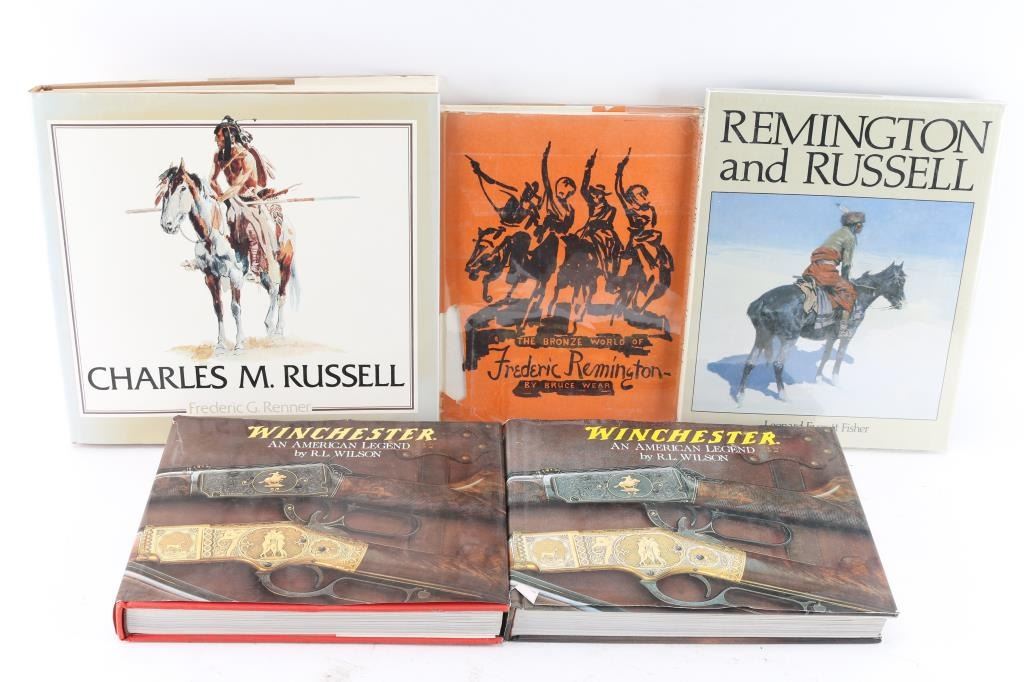 including "Charles M. Russell" by Renner, "Remington and Russell" by Fisher, 2 copies of "Winchester" by Wilson, "The Bronze World of Frederic Remington" by Wear & approx. 100 postcards of "Turquoise Mines of the United States" 6" X 9". All in good condition.