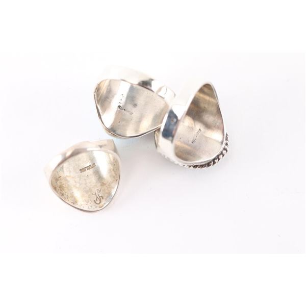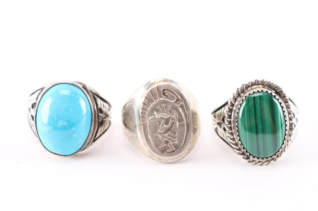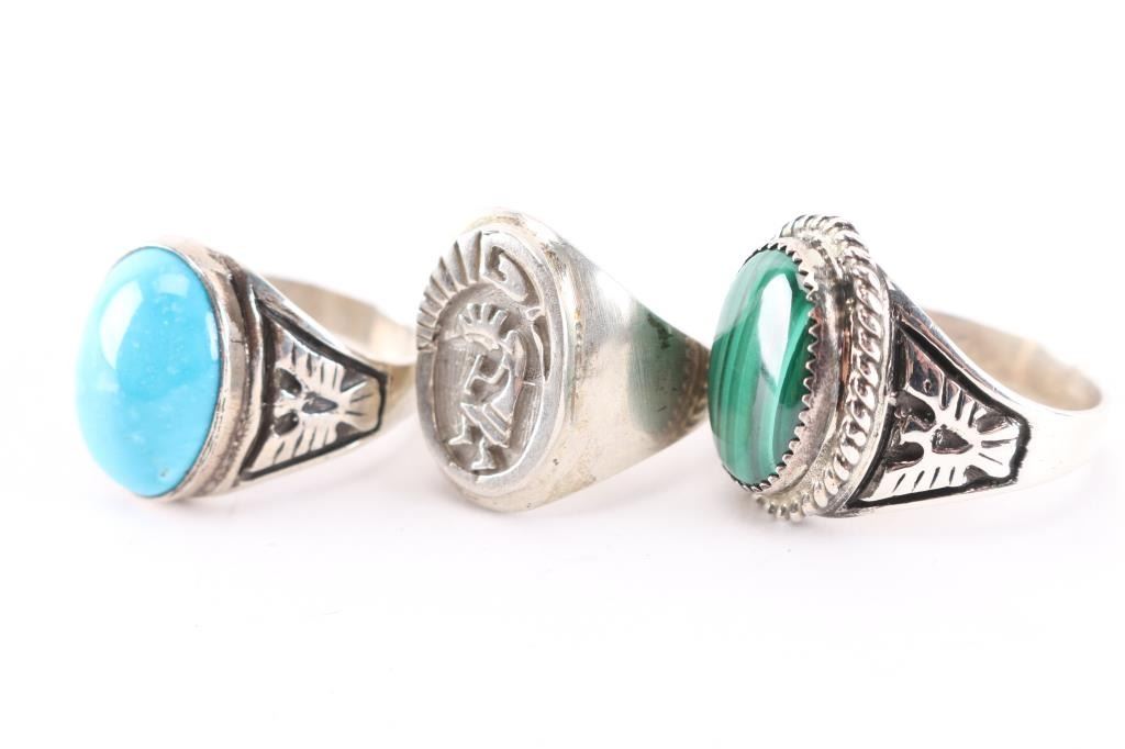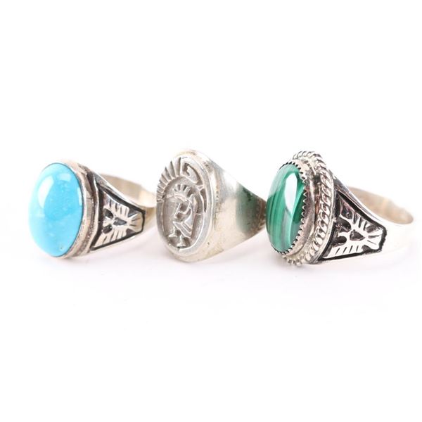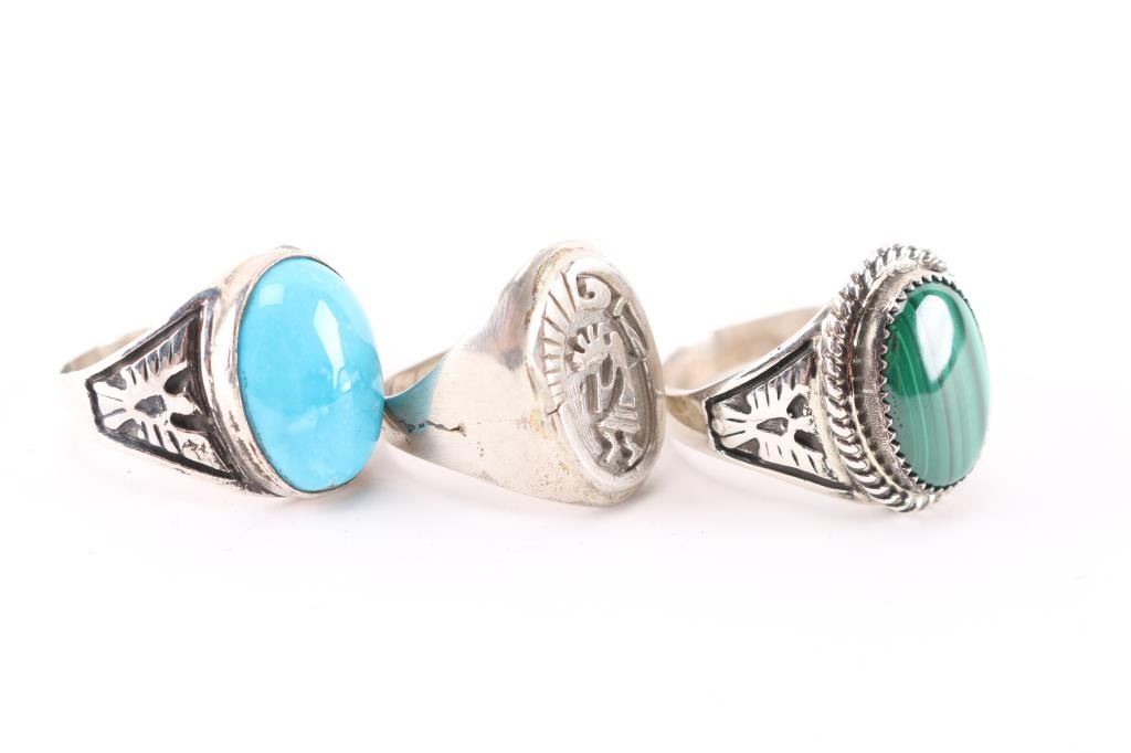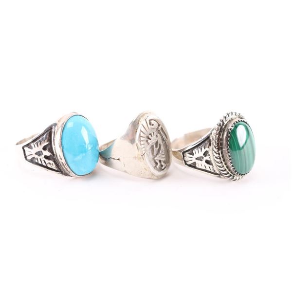 (1) Sterling silver with large oval malachite stone in center and thunderbird design on sides, size 12.(1) Sterling silver with large cabochon turquoise stone in center and etched thunderbird on sides, size 12.(1) Sterling silver with image of kokopeli etched in oval face, maker marked, size 10.