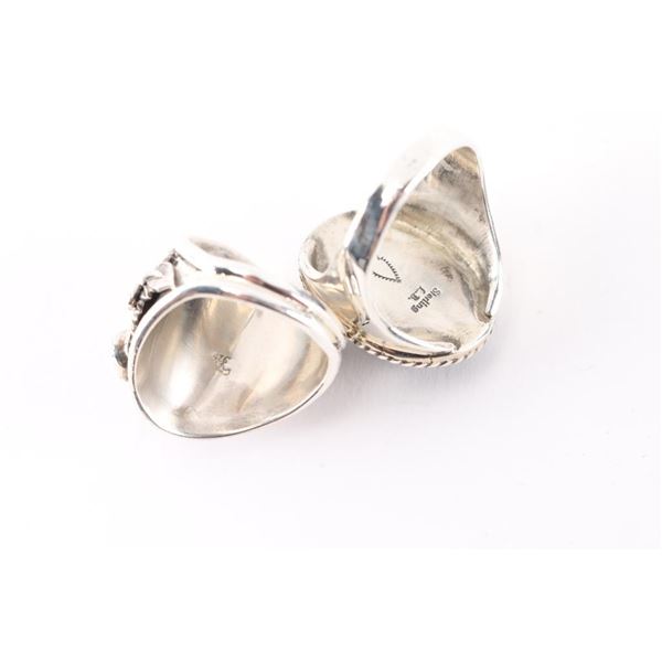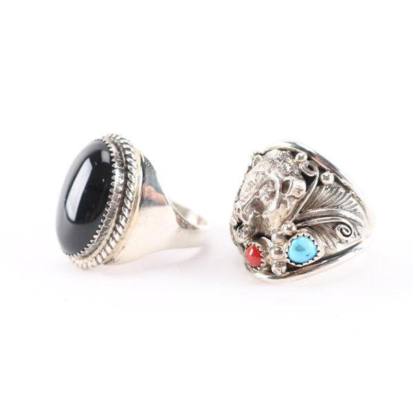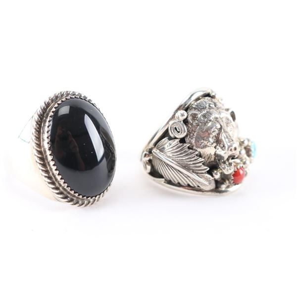 (1) Sterling silver and onyx mens ring, large cabochon at center, maker marked, size 15.(1) Sterling silver wolf with round stones of turquoise and coral accent, maker marked, size 14.