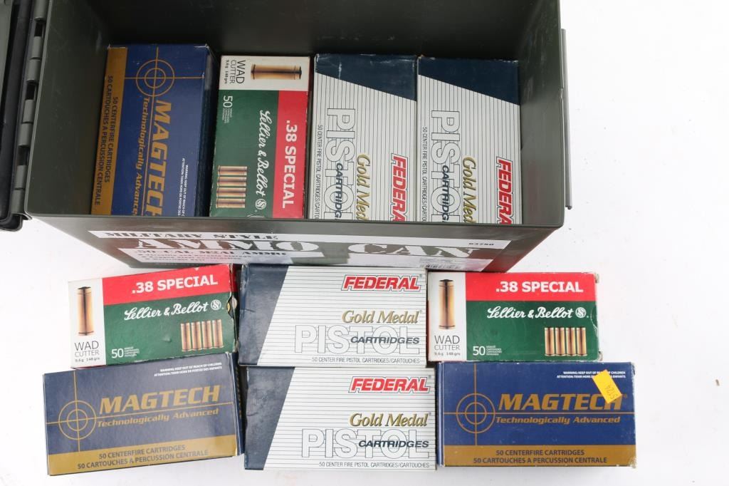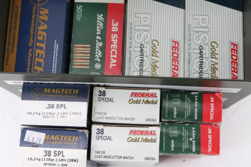 Approx. 700 rounds of 38 Special factory new ammunition. approx. 300 rds Federal 148 Gr. lead wadcutter; approx. 200 rds Magtech 158 Gr. lead round nose & S&B 148 Gr. lead wadcutter. All in factory boxes.