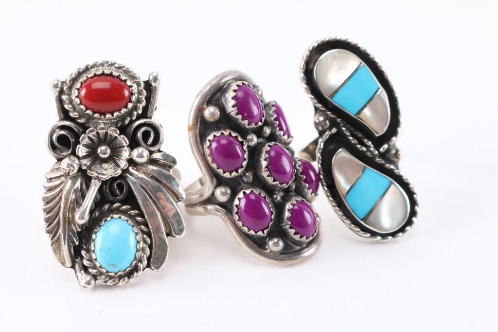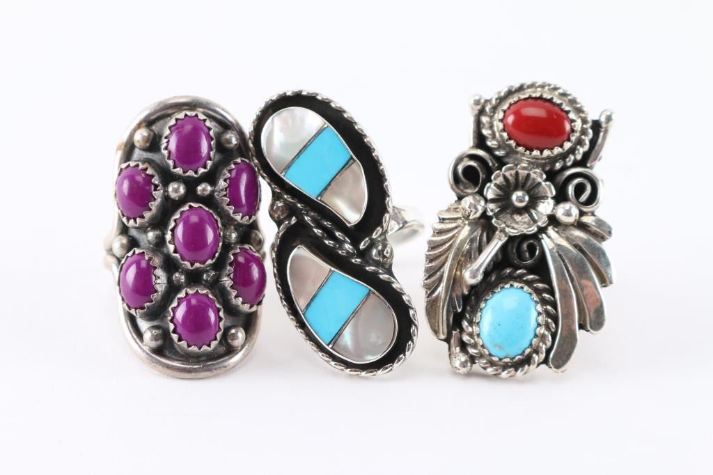 (1) Native American made sterling silver ring with 7 round purple stones, maker marked, size 5 1/2.(1) Zuni rain drop design ring made of sterling silver inlaid with mother of pearl and turquoise, size 6 1/4.(1) Navajo sterling silver ring with intricate motif and coral and turquoise stones, maker marked, size 6 3/4.