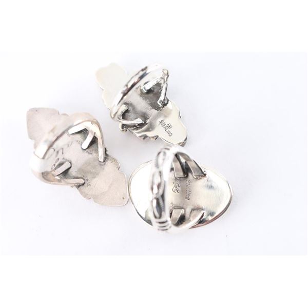 (1) Sterling silver bear claw with round turquoise cabochon, maker marked, size 7.(1) Sterling silver ring with stones of onyx, turquoise, malachite and coral, maker marked, size 7.(1) Sterling silver ring with oblong light green turquoise stone, size 8 1/2.