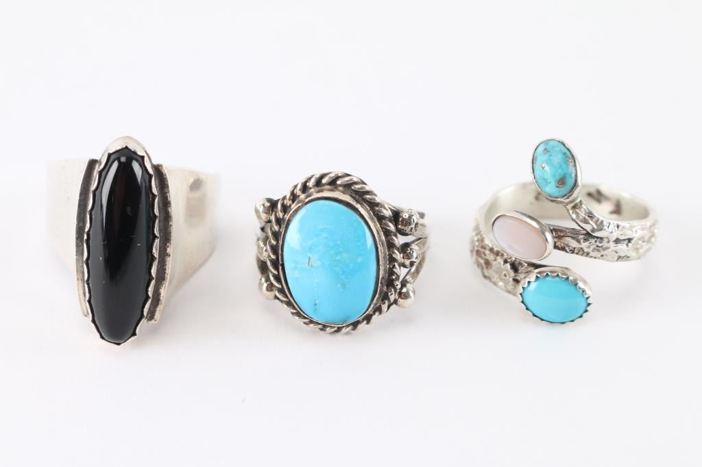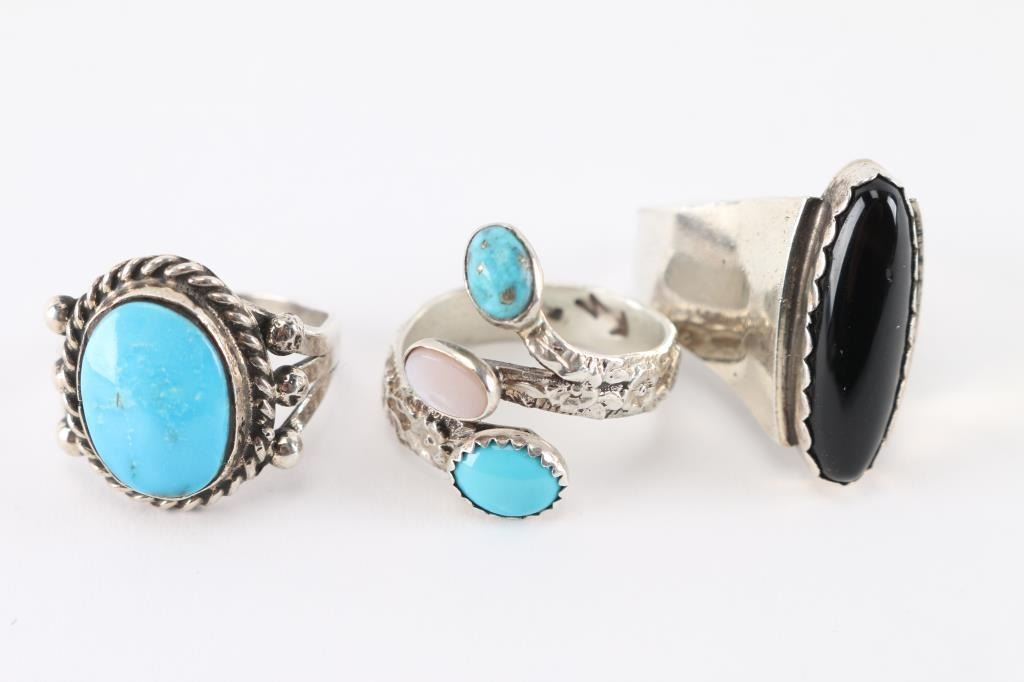 (1) Sleek design with oblong onyx stone, size 7 1/2.(1) Navajo made with round turquoise cabochon, 7 1/2.(1) Unique design with flower motif in silver, two turquoise and one mother of pearly stones, maker marked, size 7 1/2.