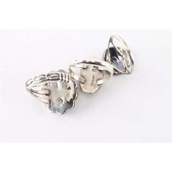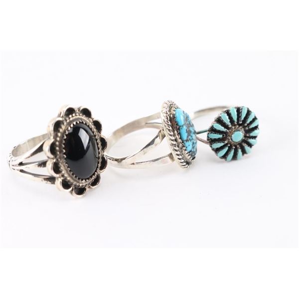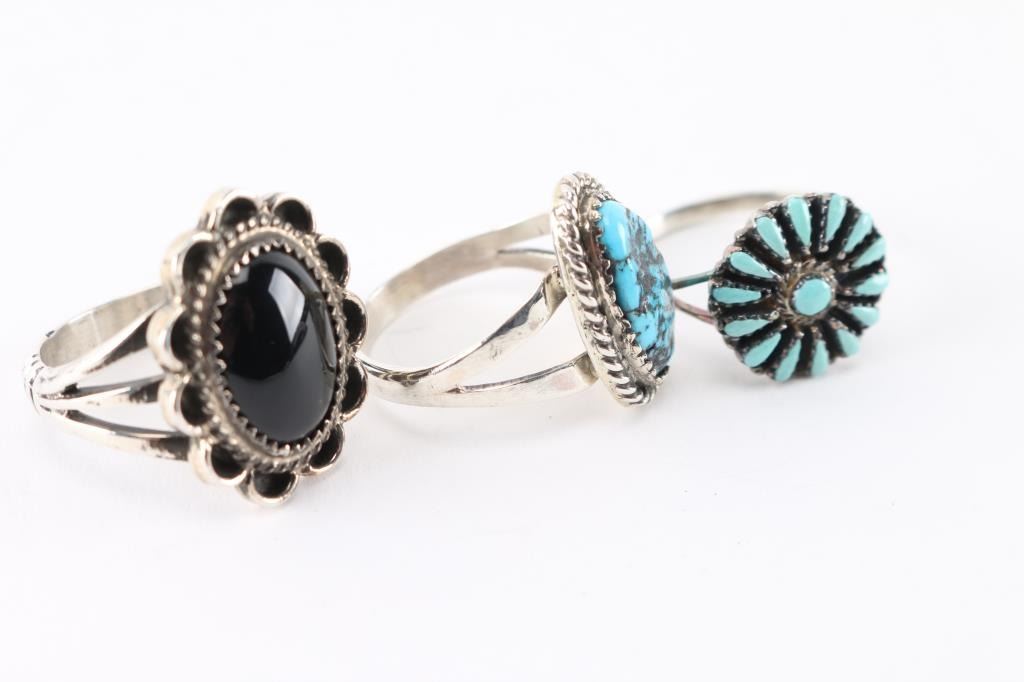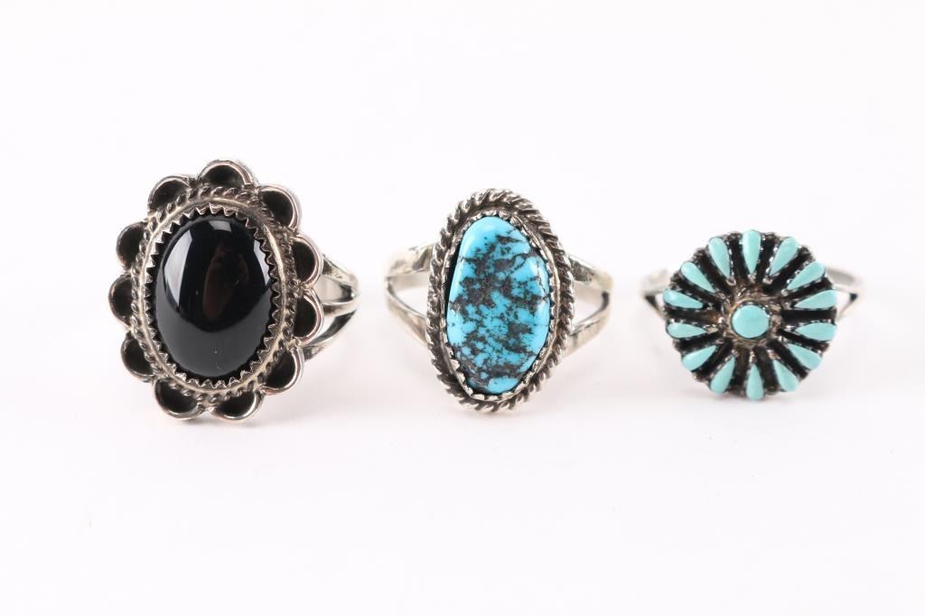 (1) Round onyx cabochon in nicely designed ring, makers marked, size 9. (1) Turquoise oval stone in rough form, maker marked, size 9. (1) Dainty Zuni needlepoint turquoise ring, size 9.
