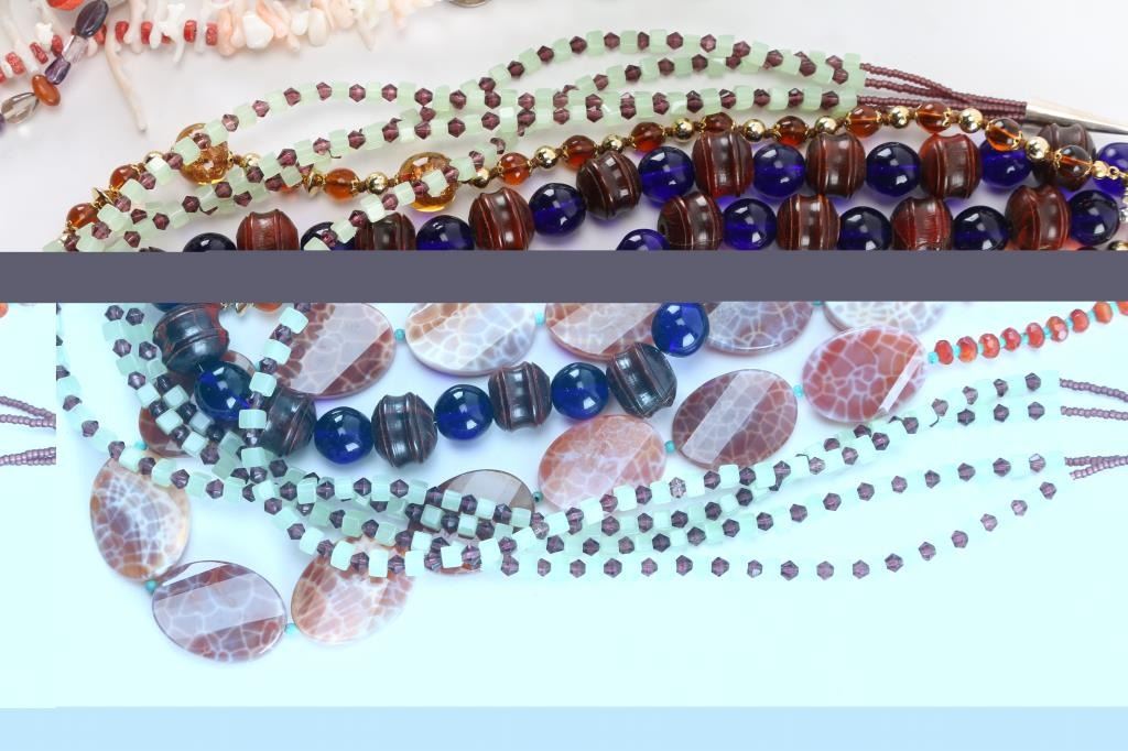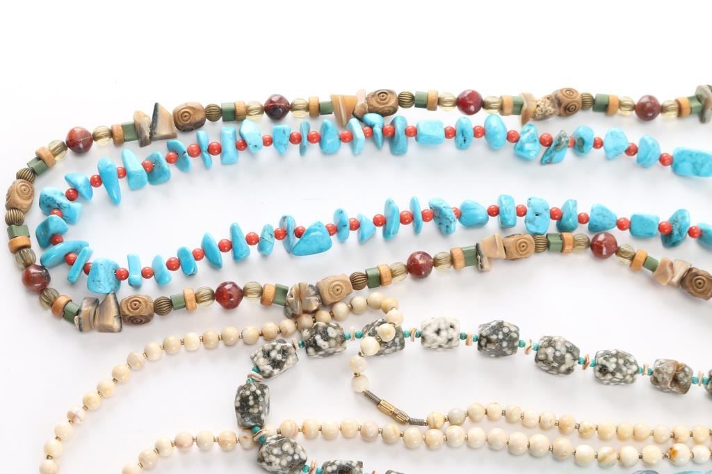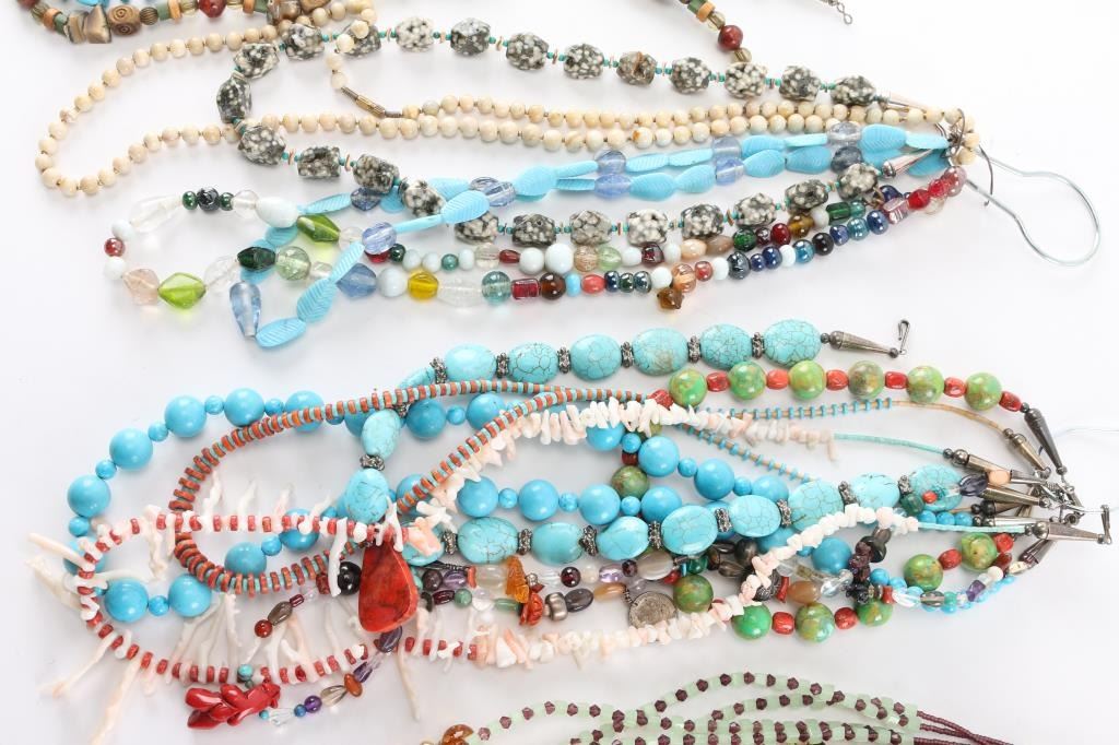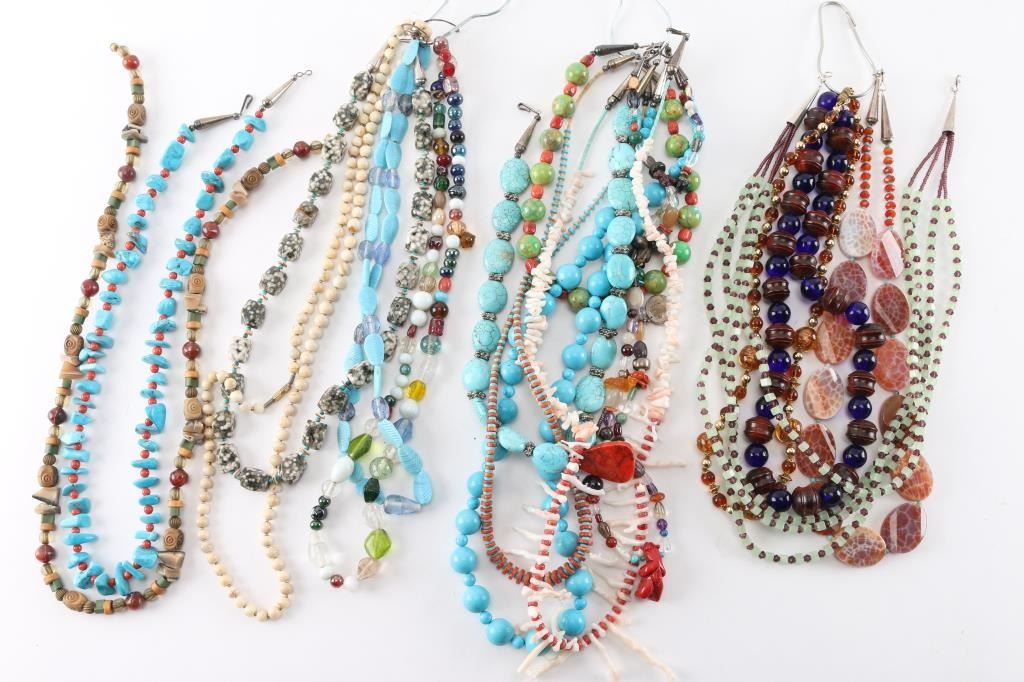(1) Large smooth turquoise beads with small turquoise beads in between and sterling silver cone closure, measures 14 1/2" from drop. (1) White branch coral and and red coral disc beads with turquoise tubes and sterling silver cone closure, measures 14 1/2" from drop. (1) Red coral and turquoise disc beads with shell and sterling silver cone closure, measures 13 1/2" from drop. (1) Turquoise nuggets and small red coral beads with sterling silver cone closure, measures 12 1/2" from drop. (1) Large green turquoise beads with red coral squared beads in between, sterling silver cone closure, measures 7" from drop. (1) Polished cream onyx-agate necklace measuring 15 1/2" from drop. (1) Beaded fetish necklace with bear pendant and 1964 dime, 13" from drop. (1) Miscellaneous bead and stone necklace, 13" from drop. (1) Glass beaded necklace, various shapes, colors, 13" from drop. (1) Snowflake obsidian beaded necklace, 11 1/2" from drop. (1) Carved turquoise beaded necklace with blue glass beads, measures 10 1/2" from drop. (1) Light green jade glass and brown crystal and seed bead necklace, 12" from drop. (1) Fire agate slices with tiny turquoise beads in between, measures 11" from drop. (1) Vintage Murano gold foil glass beads, 10" from drop. (1) Large cobalt blue beads with carved amber, 10 1/2" from drop.