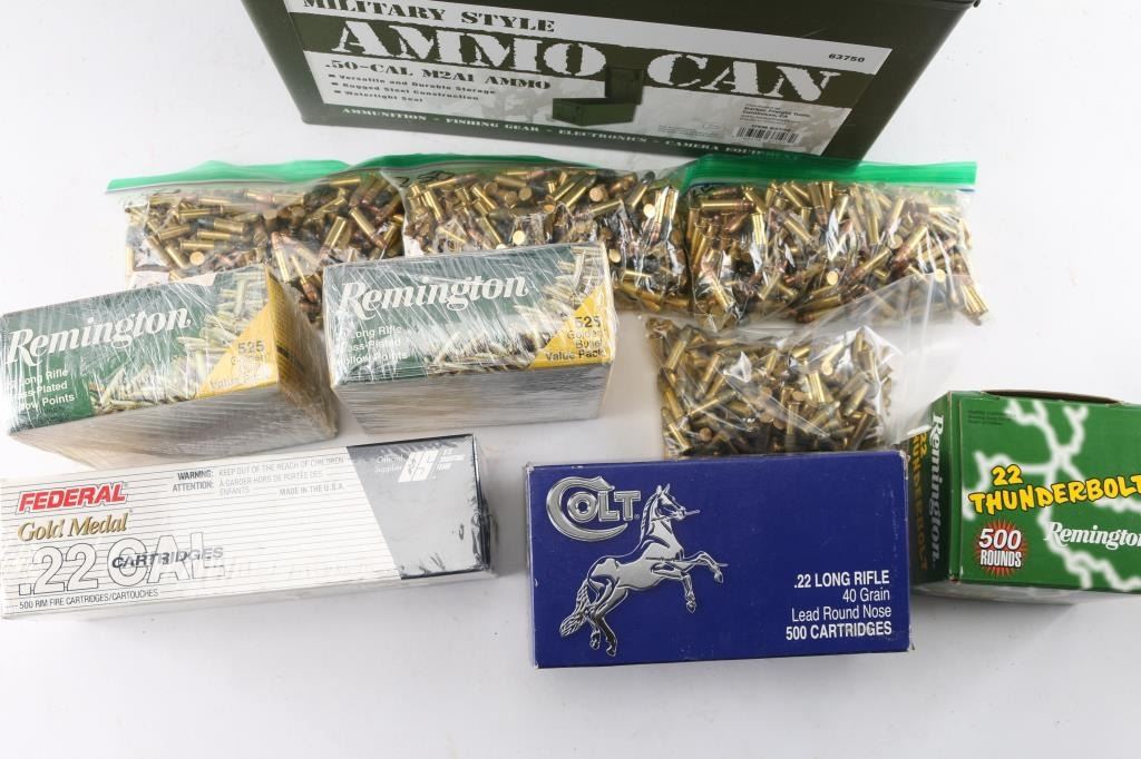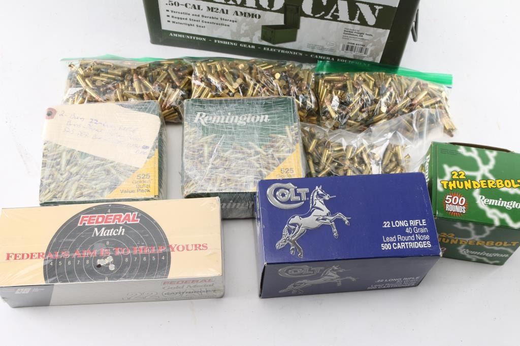 Approx. 3400 rounds of .22 Long Rifle factory new ammunition. approx. 1050 rds Remington, 40 Gr. brass-plated HP; approx. 850 rds of mixed brands in ziplock bags; approx. 500 rds Federal, 40 Gr. solid projectile; approx. 500 rds Remington round nose; approx. 500 rds Colt 40 Gr. lead round nose. In factory boxes and ziplock bags.