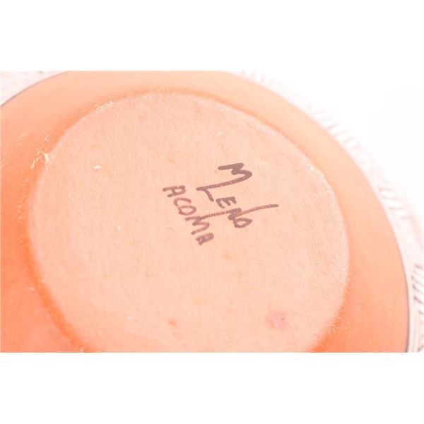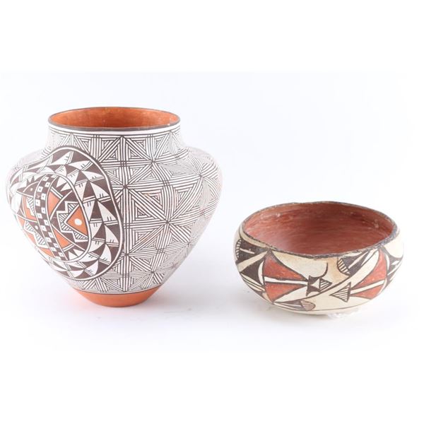 (1) Acoma polychrome pot, geometric design, has large crack. Measures 8"x9", signed "Meno".(1) Older Acoma pot, minor scattered losses and small chip to rim. Measures 6"x4".