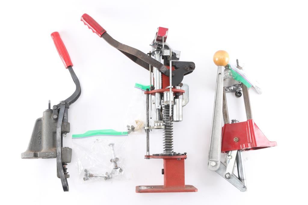 (1) Lee Precision 3 turret w/357 dies installed; (1) MEC Model 650 Shotgun 6 turret and (1)Lyman 450 lube press bullet sizer. All fair to good condition.