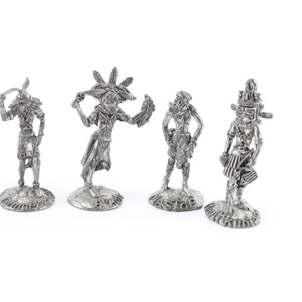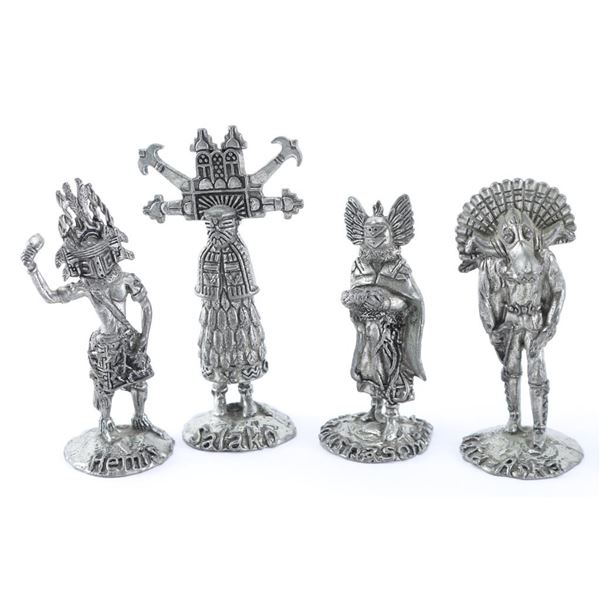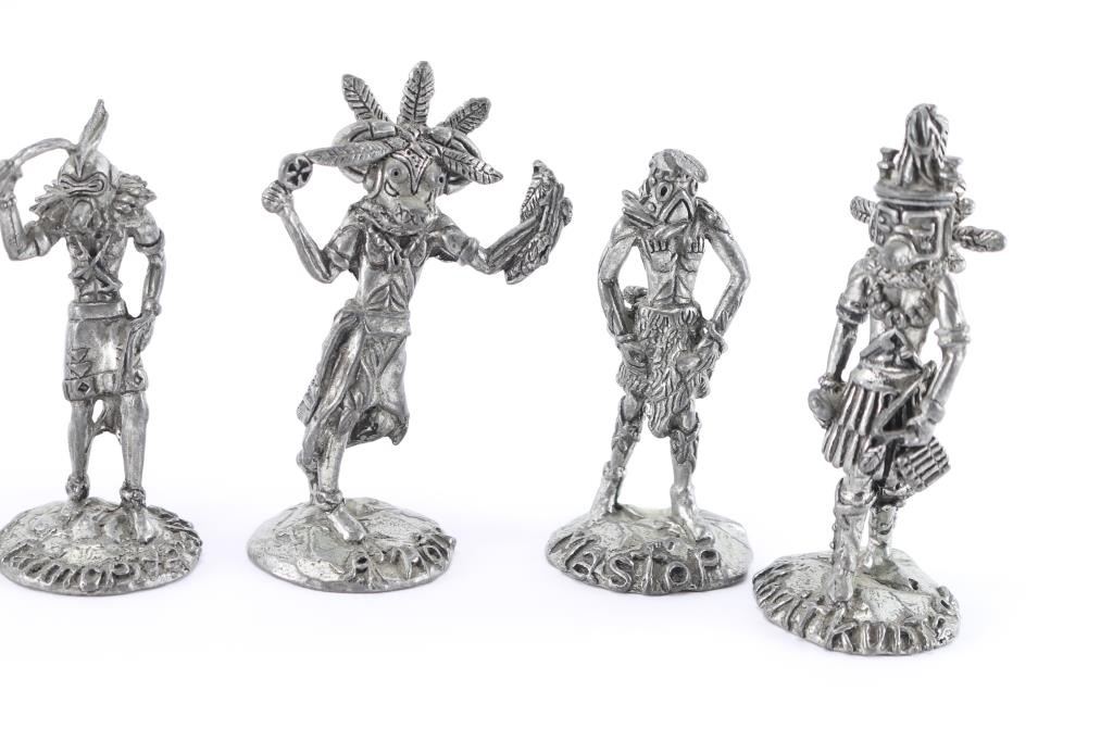 Set of 8 Hopi pewter Kachinas. Includes Mastop, Salako, Hemis, A Hote, Nata-Aska, Movitkuntaqa, Angwusnasomtaga, Taimopiyaakya. 2 marked "Windy" on the bottom. Measures from 2-1/2" to 3-3/4" in height