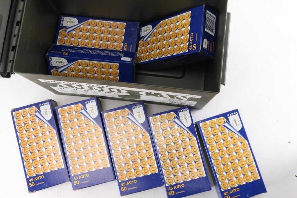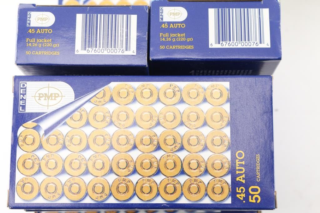 Approx. 400 rounds of 45 ACP factory new ammunition. Pretoria Metal Pressings (PMP) made in South Africa. 220 Gr. FMJ. All in factory boxes.