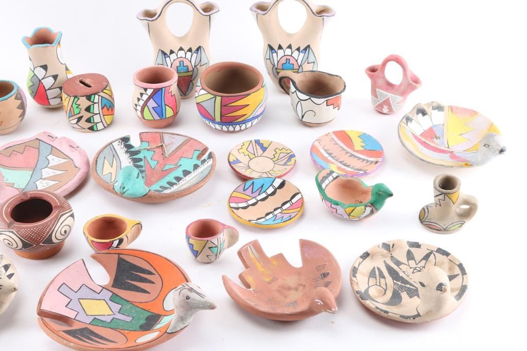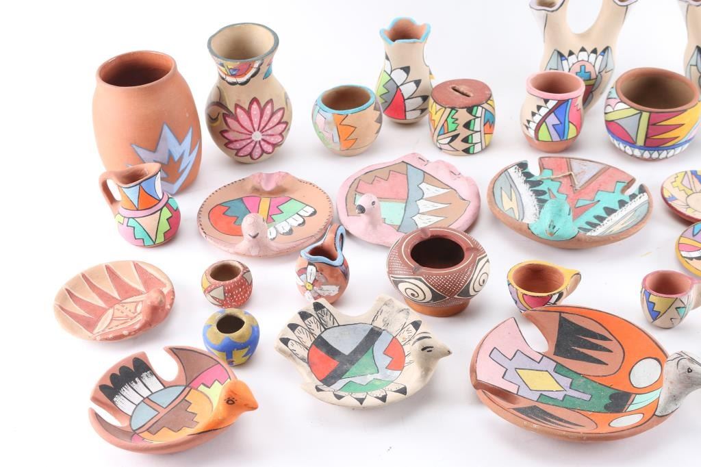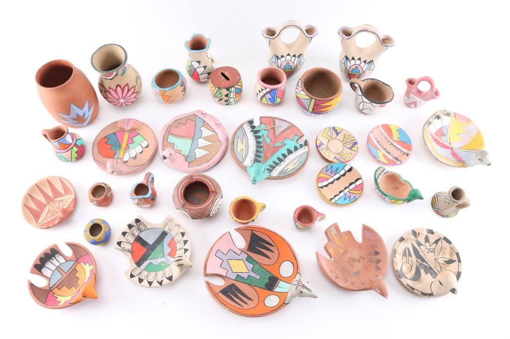 (3) Wedding vases, 2 measuring 6" and one measurin; 1/2"; (3) Pitchers measuring 2 1/2" each; (2) Small cups 1 1/2" each; (3) Small plates measuring 3", 3 1/4" and 3 1/2"; (5) round bowls the largest of which measures 3" x 3"; (1) bowl ashtray; (1) piggy bank; (3) vases the larges of which measures 5" x 3"; (11) bird effigy plates, the largest of which measures 7 1/2" x 6"; (1) small candlestick holder.