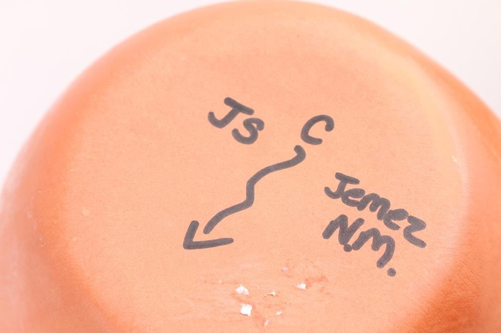 1 Maricopa 2 figure bowl measures 5" x 5", corrugated pot with scattered chips on rim 7" x 6", large decanter signed C. Talayumptewa 12" x 9", contemporary Jimenez vase 8" x 5", Santa Clara painted scalloped bowl 7" x 3", small Santa Clara vase 5" x 3", unknown terra cotta wedding vase 7" x 5", Acoma bowl by Randy Heyah 7" x 4".