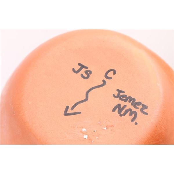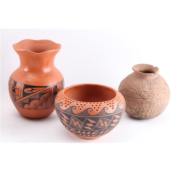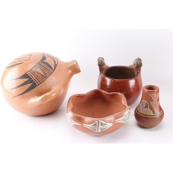 1 Maricopa 2 figure bowl measures 5" x 5", corrugated pot with scattered chips on rim 7" x 6", large decanter signed C. Talayumptewa 12" x 9", contemporary Jimenez vase 8" x 5", Santa Clara painted scalloped bowl 7" x 3", small Santa Clara vase 5" x 3", unknown terra cotta wedding vase 7" x 5", Acoma bowl by Randy Heyah 7" x 4".