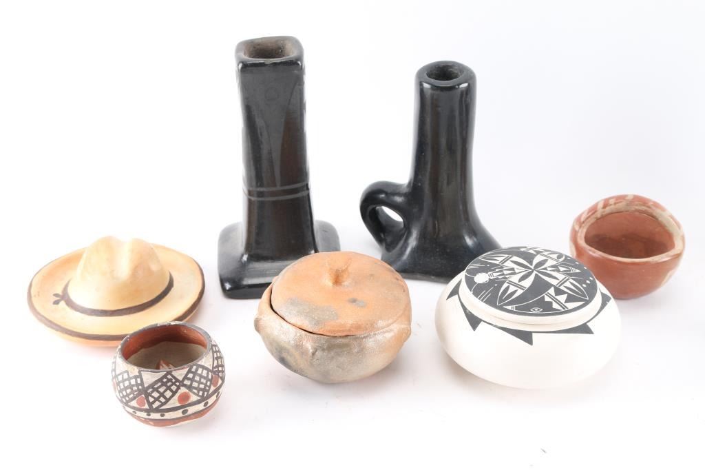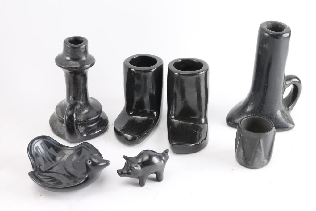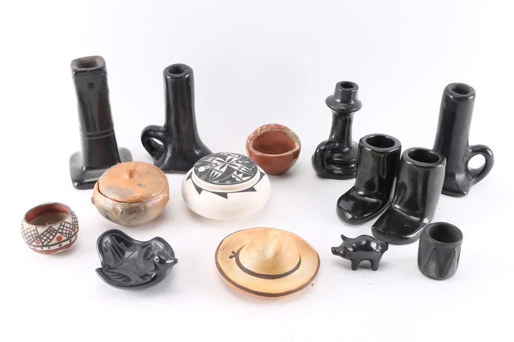 Including 4 blackware candlesticks, potter boots, lidded Acoma jar, clay hat, and several others
