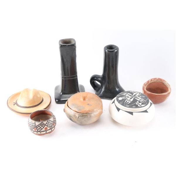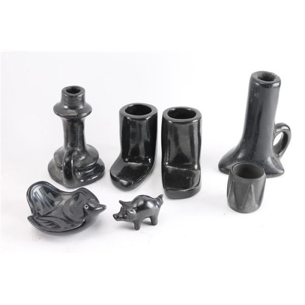 Including 4 blackware candlesticks, potter boots, lidded Acoma jar, clay hat, and several others