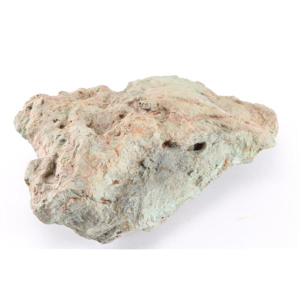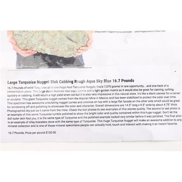 7,575 grams, 16.7 pounds, of rough aqua green turquoise with a light golden matrix. Great for carving, cutting, lapidary or cabbing. Will return a high yield when cut or is impressive as a conversation piece in its natural state. From the Alacran Mine in Mexico, dimensions are 14.5" long by 9.5" wide by about 4.75" thick.
