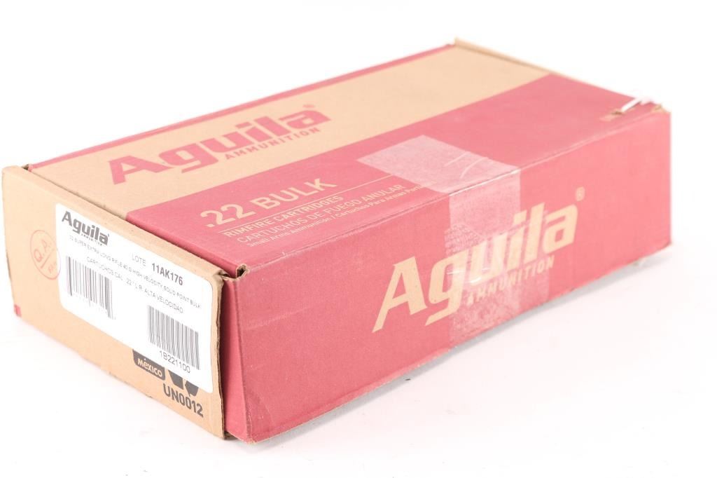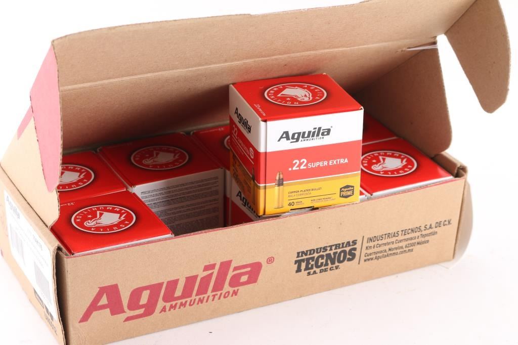 Approx. 2000 rounds of .22 Long Rifle factory new ammunition. Aquila 40 Gr. copper-plated jacket, non-corrosive. 8 boxes of 250 rds, in cardboard case.