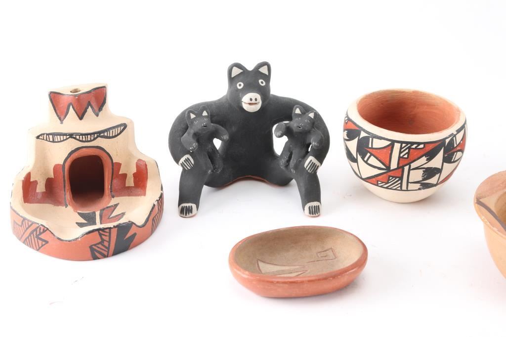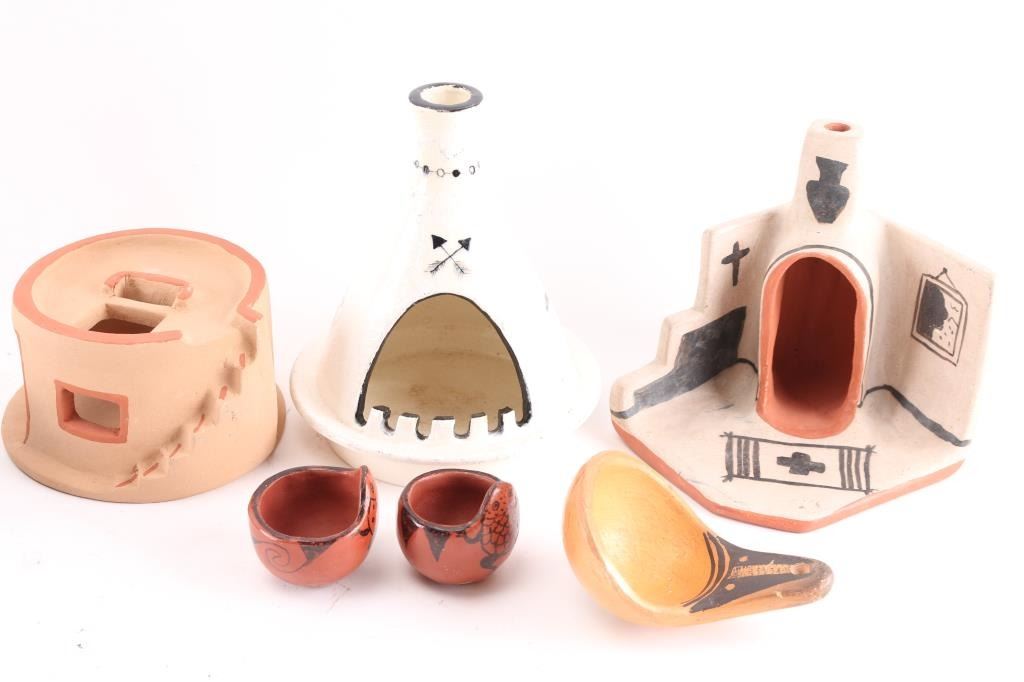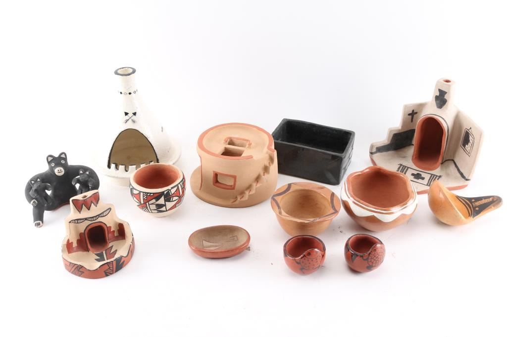 Features 4 clay incense chimneys, 2 small Maricopa pots, and several others.