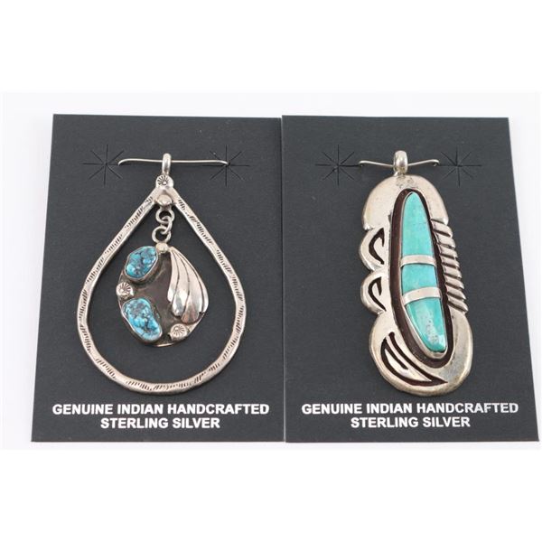 (1) Long oval turquoise pendant in sterling silver, measures 2 1/2" x 1". (1) 2 turquoise stones in center sterling center drop with outer tear shape, measures 2 1/2" x 1 1/2".