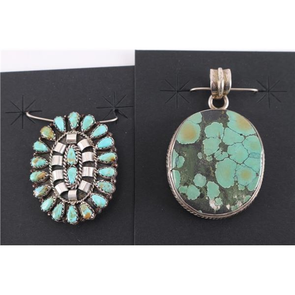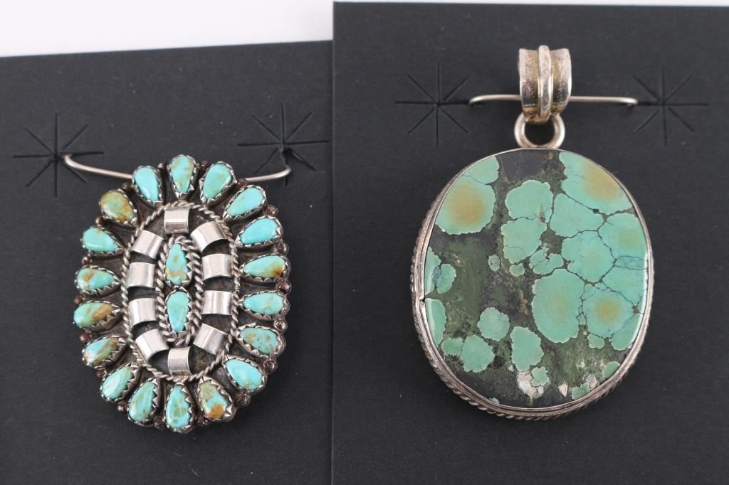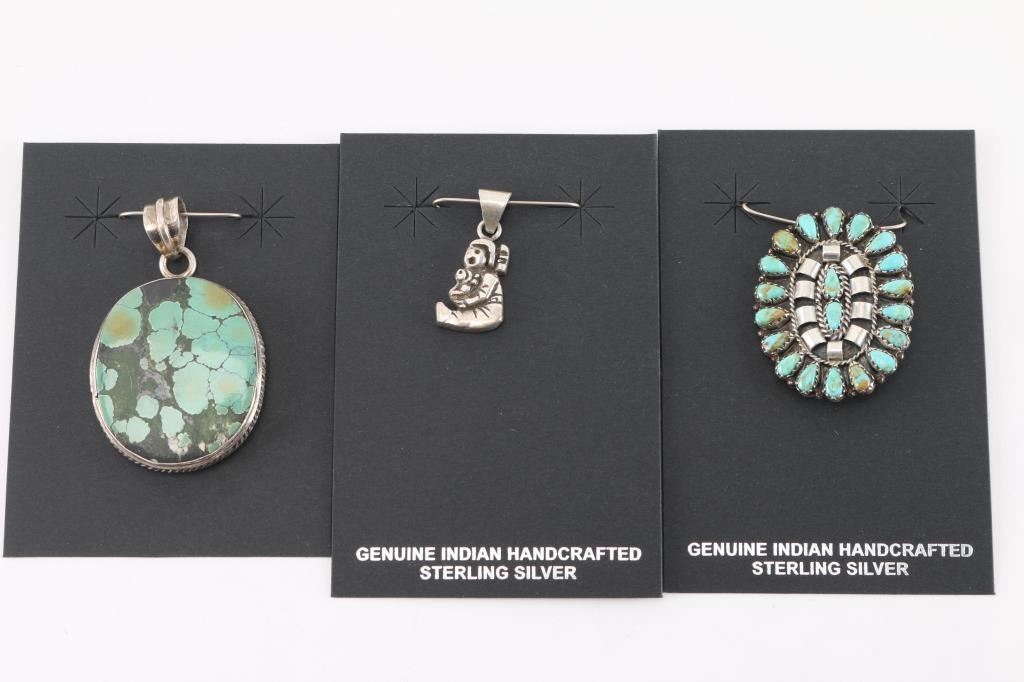 (1) Turquoise stone surrounded by sterling ring, measures 1 1/4" x 1". (1) Petite point turquoise oval pendant measuring 1 1/2" x 1". (1) Small sterling storyteller pendant measuring 1" x 1/2", maker marked.