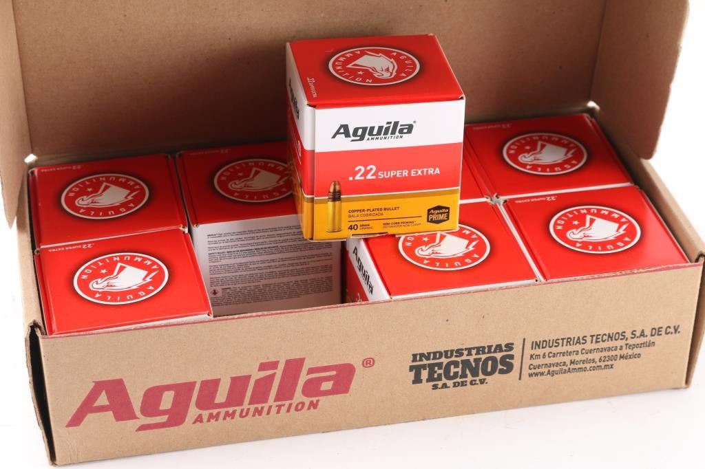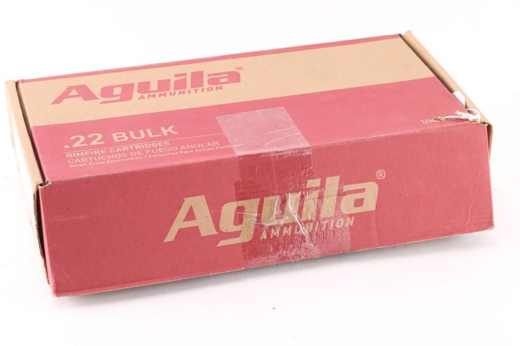Approx. 2000 rounds of .22 Long Rifle factory new ammunition. Aquila 40 Gr. copper-plated jacket, non-corrosive. 8 boxes of 250 rds, in cardboard case.