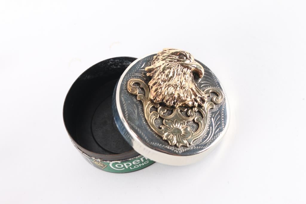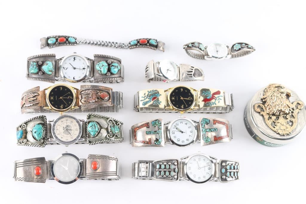 (3) Ladies watches, sterling silver, some with turquoise, coral, various designs. (One missing the watch piece.)(7) Mens watches, sterling silver, some with turquoise, coral and various designs. (1) Gold and silver eagle design cover for chewing tobacco container.