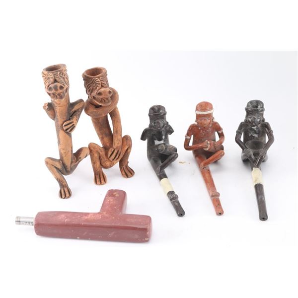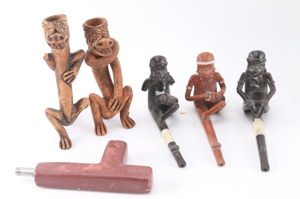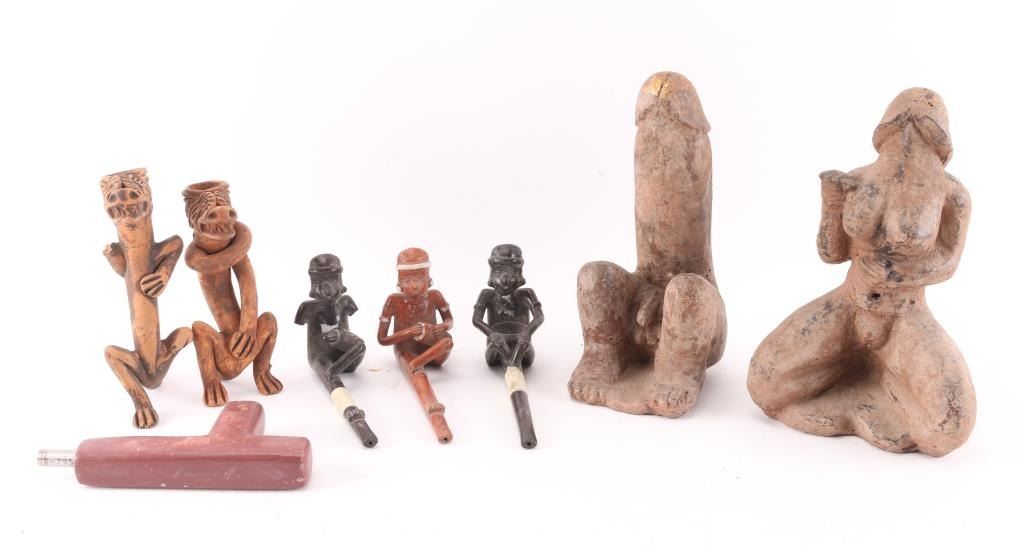 (3) Pre-Columbian male and female figure Pipes. (One has two broken arms.)(2) South American fertility pottery pieces, mail and female.(2) Miscellaneous fertility art pieces (one broken).(1) Navajo made catlanite pipe bowl.