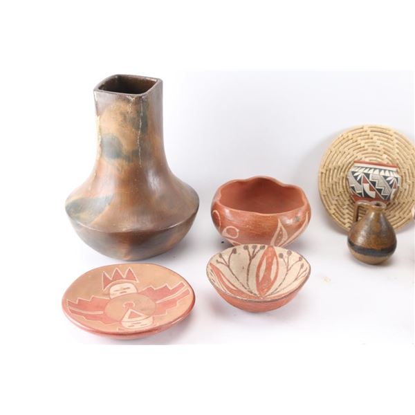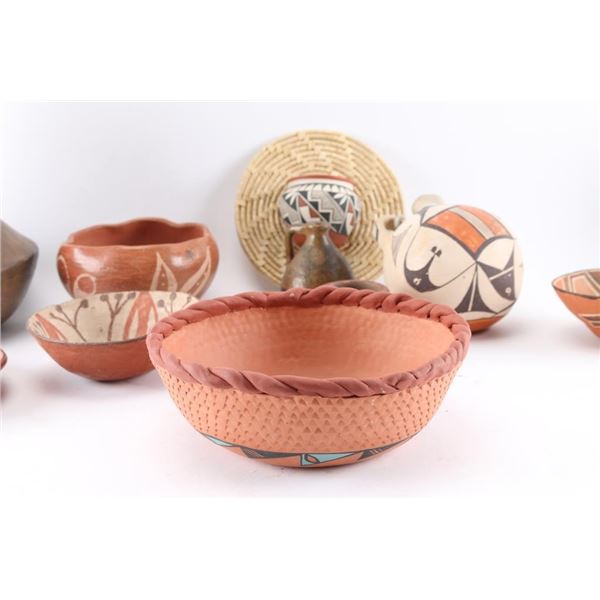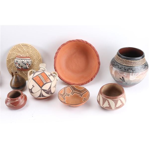 Large Navajo vase 11" x 7", Acoma painted bowl 8" x 4" signed, and several others