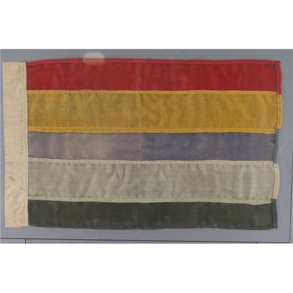 1) WW2 Italian Fascist flag. 34" x 36". The Italian Fascist regime was led by Benito Mussolini from 1922 to 1943. three piece construction with all colors a separate piece. The Savoy Coat of Arms is dyed into the white central portion. No crown, has hanging ties. Flag has some moth damage and blood stains.2) Framed flag and map of the first Republic of China. ( 1912-1928)he stripes on the First Republic of China flag, also known as the "Five-Colored Flag," represented the five major ethnic groups in China: red for the Han Chinese, yellow for the Manchu, blue for the Mongols, white for the Hui people, and black for the Tibetans; each color signifying a different ethnicity, with the five stripes symbolizing unity under one nation. 18 x 11 1/2" Stitching intact, a couple of very minor moth nips. Frame measures 27" x 23". Very rare to find an original.