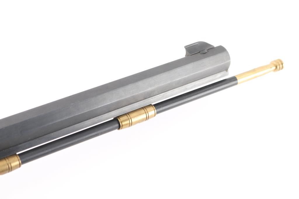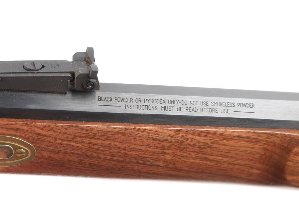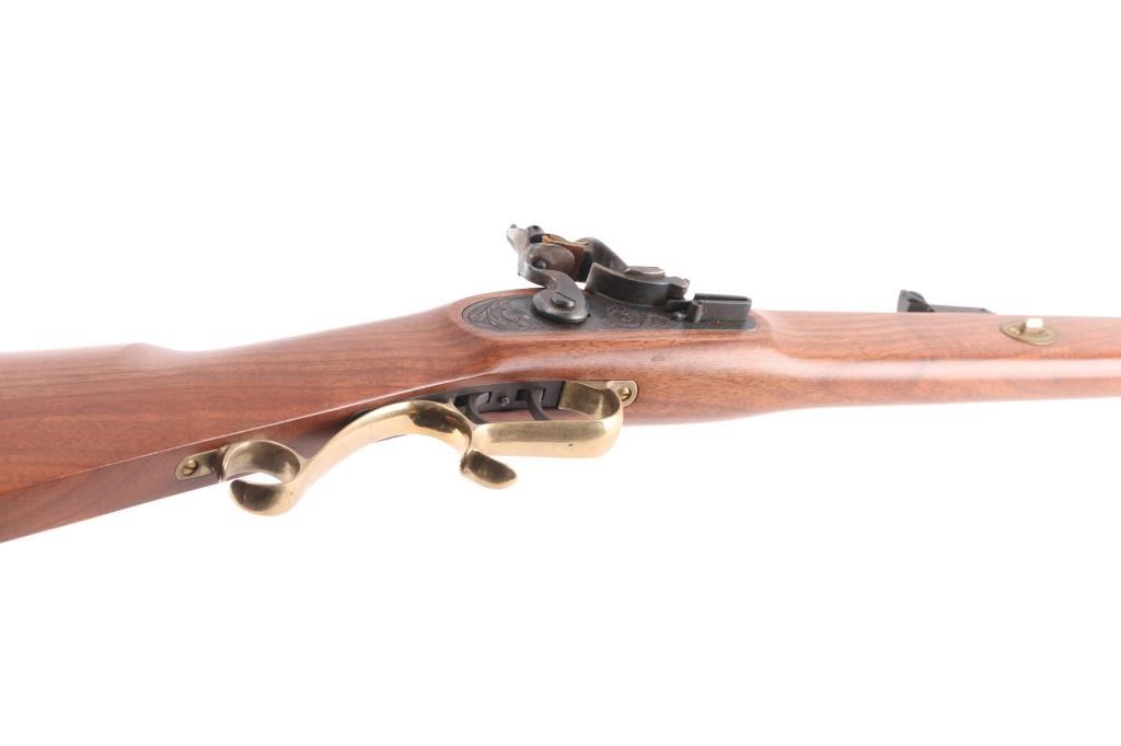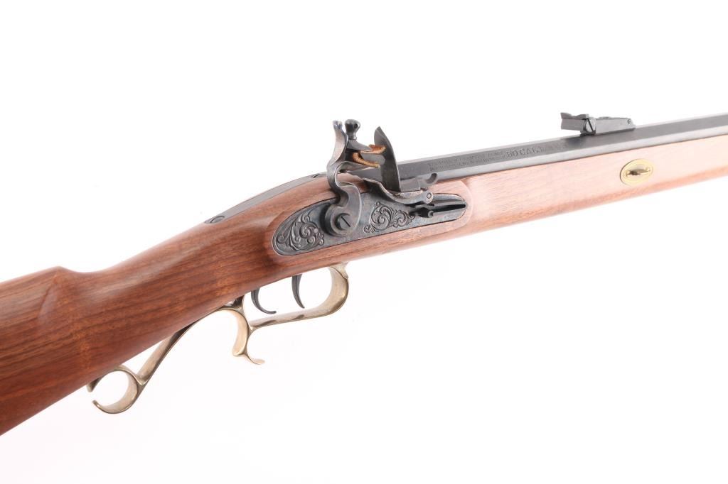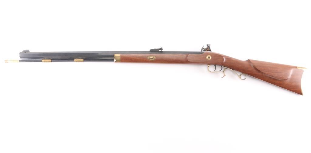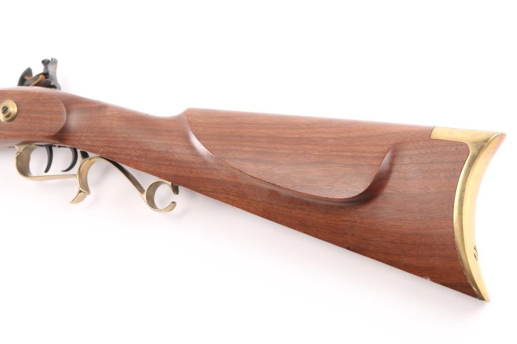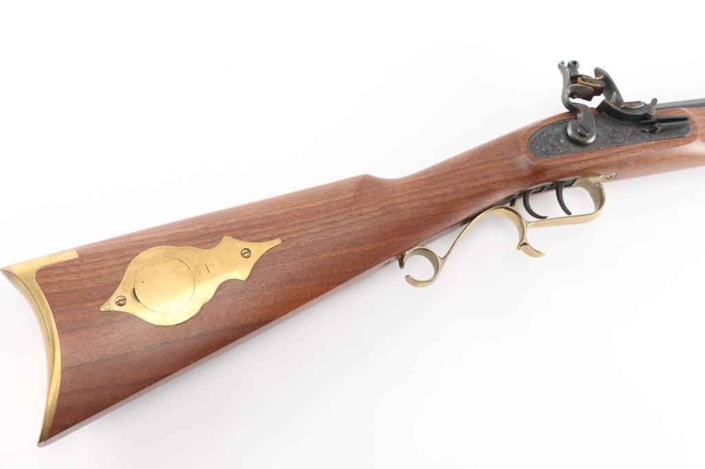 Single shot muzzle loading flintlock plains rifle chambered in 50 Caliber. Features a blued 29" octagon barrel, blade/bead front & adjustable rear sights, black polymer ramrod with brass end cap, half stock with brass fittings and fancy trigger guard, brass crescent buttplate and patch box, double set triggers, case colored hammer and lock with laser engraving. Retains approximately 95% finish and wood is fine with one small dent on the bottom left of butt stock. Action is smooth and bore is excellent. Comes with factory box. NRA condition is Excellent.***Antique Firearm***