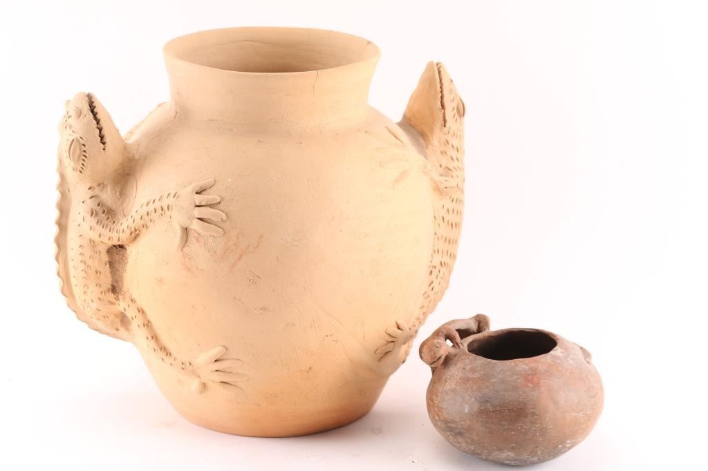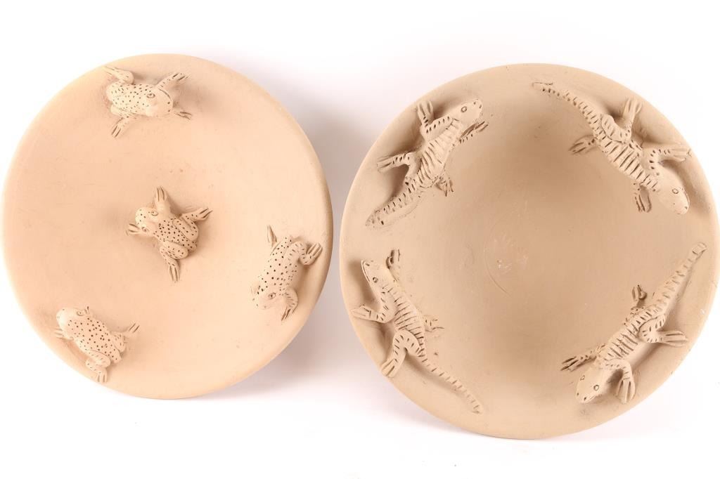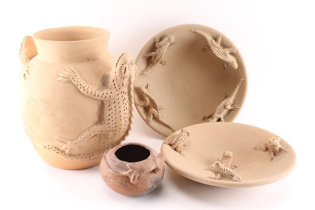 Large frog bowl 13" x 3", large lizard pot 13" x 16", large lizard bowl 13" x 4", small lizard bowl 4" x 6"