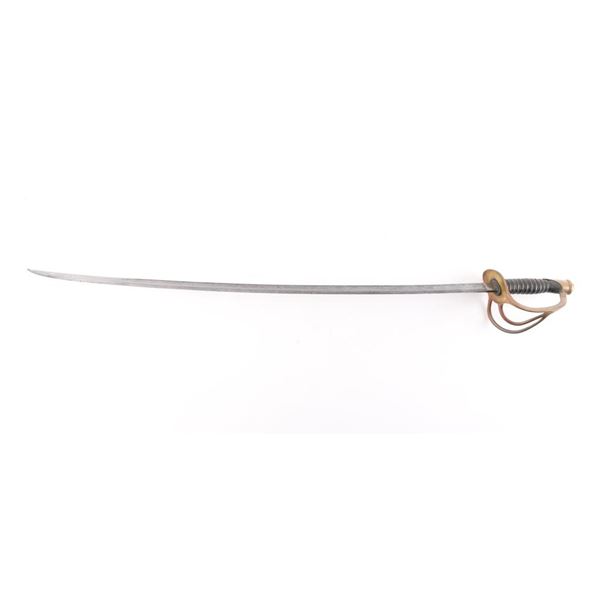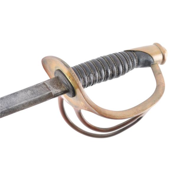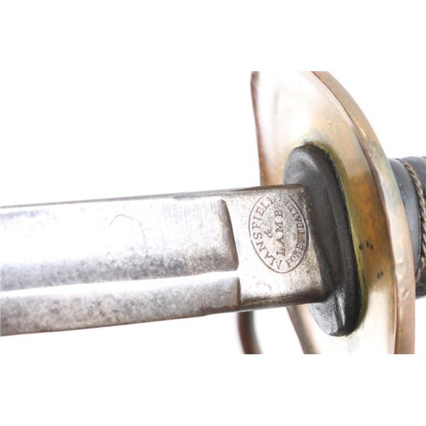 Very desirable maker. A Model M1860 cavalry saber manufactured by the Mansfield & Lamb Company out of Forestdale, RI in 1865. The sword has a 35", curved, fullered blade that features the makers mark on the ricasso and "U.S., 1862", and inspector G.W.C. is on the reverse. The guard is cast in brass, original leather washer intact. The hilt is wrapped in black leather with full wire wrapping intact. Overall good condition with small bend to the tip of the blade, the blade has areas of dark patina, no pitting or nicks, nice mellow patina to the brass. Feint inspectors initials on the pommel. Markings are crisp/clear. No Sscabbard.
