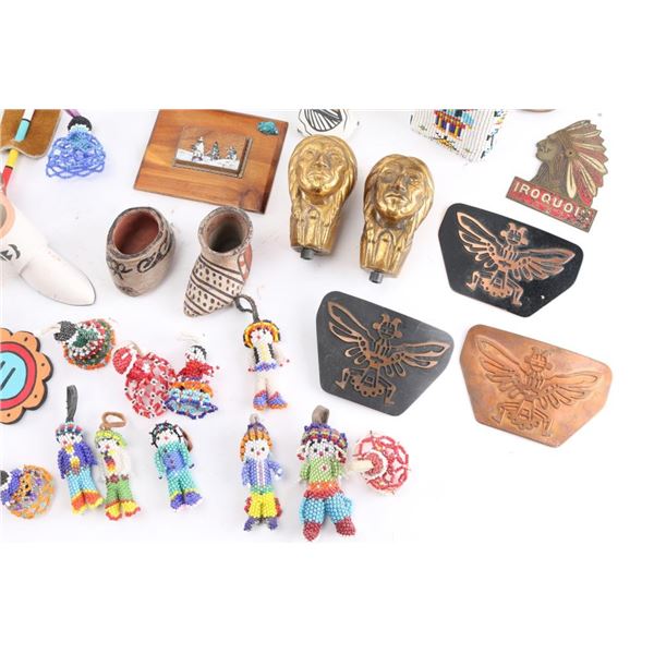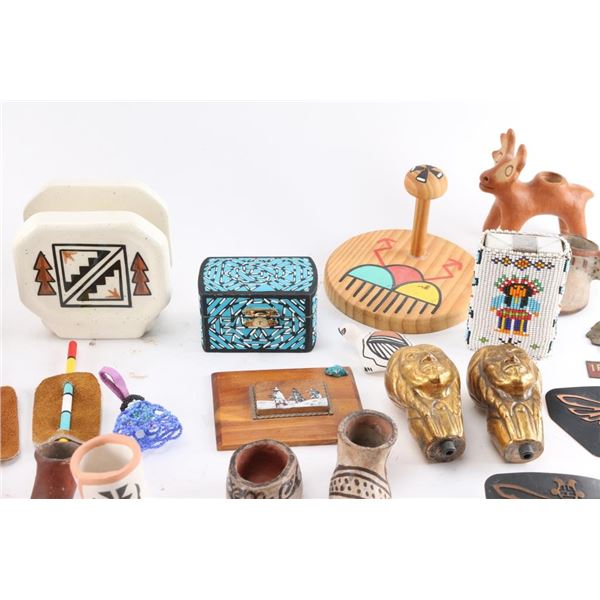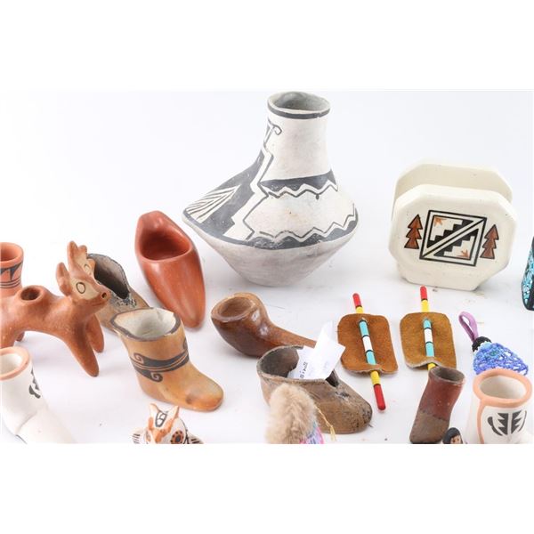 Includes a b/w duck pot, small beaded figures, small pots, hair barrettes, small pottery boots, belt buckles and more.