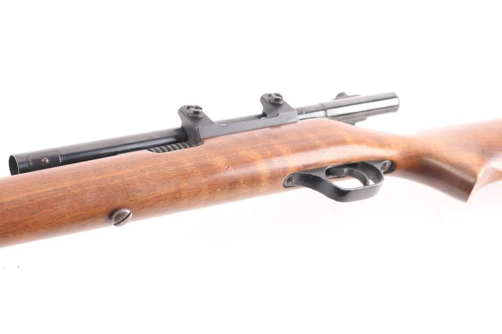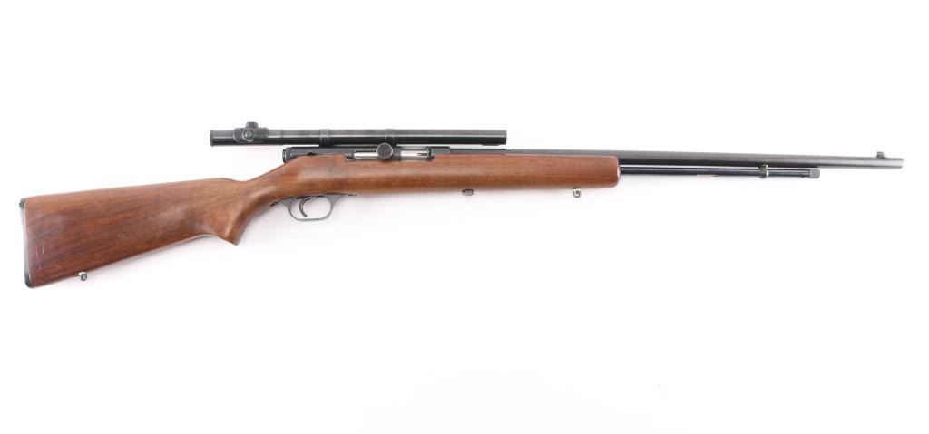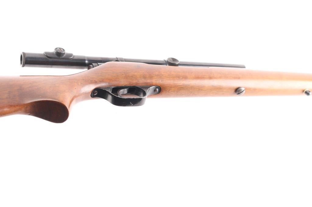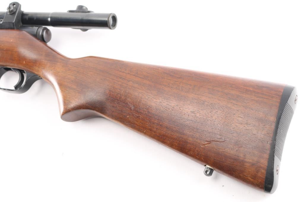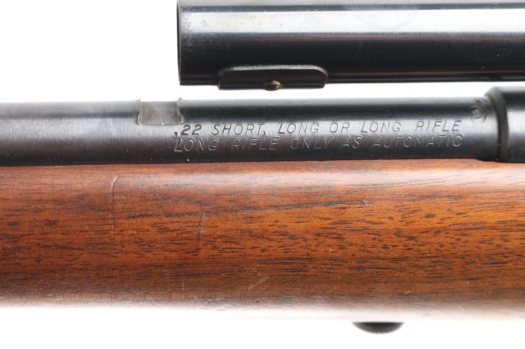 Vintage semi-automatic sporting rifle chambered in .22 LR. Manufactured 1938-50. Features a 24" blued barrel and receiver with a dovetailed blade/bead front sight, rear sight removed mounted with a vintage, unmarked 4X scope with fine crosshair reticle, clear optics , 3/4 length magazine tube, serrated trigger and a cylindrical charging handle that pushes inward to lock the bolt open or closed with a thumb safety on the top right. Vented chamber. It sits in a one piece, smooth pistol grip wood stock with a black plastic butt plate and sling studs. Blue metal finish is about 96% with minor scratches, wood is very good with minor scratches, dings. NOTE* the bore has a a dark circle about 4 1/2" from the muzzle causing a slight bulge in the barrel.NRA Condition-Poor/Barrel. C&R Firearm.